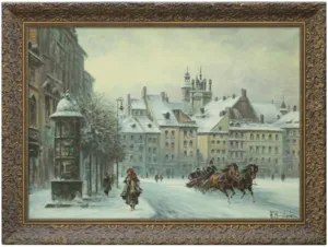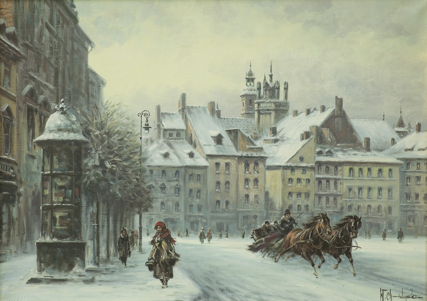 Władysław Chmieliński (Warszawa 1911 - Warszawa 1979) był malarzem związanym z Warszawą, gdzie stale mieszkał i pracował. W latach 1926-1931 studiował w warszawskiej Miejskiej Szkole Sztuk Zdobniczych i Malarstwa (dawna Klasa Rysunkowa). Wiodącym tematem jego obrazów były widoki miejskie, malowane olejno i akwarelą. W latach 1935-1938 stworzył cykl akwarel przedstawiających obiekty polskiej architektury; wśród nich, widoki Sandomierza, Krakowa, Kazimierza nad Wisłą, a także wnętrza zabytkowych kościołów czy pałaców, m.in. Zamku Królewskiego w Warszawie i Pałacu w Wilanowie. Malował także pejzaże i wiejskie sceny rodzajowe – kuligi, sanny, zaprzęgi, wesela, konie na tle krajobrazu. W latach 1967-1969 wyjeżdżał na dłuższe pobyty do Danii. W latach 1936-1939 artysta używał także pseudonimu „Władysław Stachowicz”.