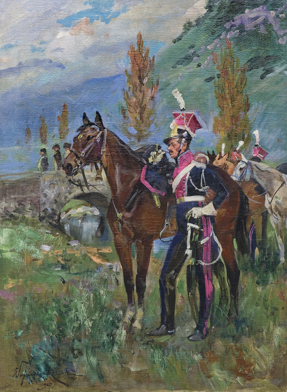 Wojciech Kossak (Paryż 1856 - Kraków 1942 ) – powszechnie znany malarz, postrzegany przede wszystkim jako świetny batalista. Syn i uczeń Juliusza Kossaka kształcił się w krakowskiej Szkole Sztuk Pięknych, w Akademii monachijskiej oraz w Paryżu. W latach 1895-1902 przebywał głównie w Berlinie, pracując dla cesarza Wilhelma II. Wiele podróżował, m.in. do Hiszpanii i Egiptu, gdzie wykonywał szkice do zamierzonych panoram. W późniejszych latach kilkakrotnie wyjeżdżał do Stanów Zjednoczonych wykonując zamówienia portretowe. W 1913 był mianowany profesorem warszawskiej Szkoły Sztuk Pięknych. W latach I wojny światowej pełnił służbę wojskową. Był współautorem panoram: „Racławice” (1893-1894), „Berezyna” (1895-1896), „Bitwa pod piramidami” (1901) oraz szkiców do niezrealizowanej „Somosierry” (1900). Z temperamentem i swobodą tworzył szeroko malowane, dynamiczne sceny batalistyczne, historyczne, rodzajowe oraz liczne portrety. Z upodobaniem malował konie. Jego obrazy, gloryfikujące dawne i współczesne artyście polskie wojsko i bohaterstwo żołnierzy, trafiały do patriotycznych uczuć odbiorców i cieszyły się ogromna popularnością.