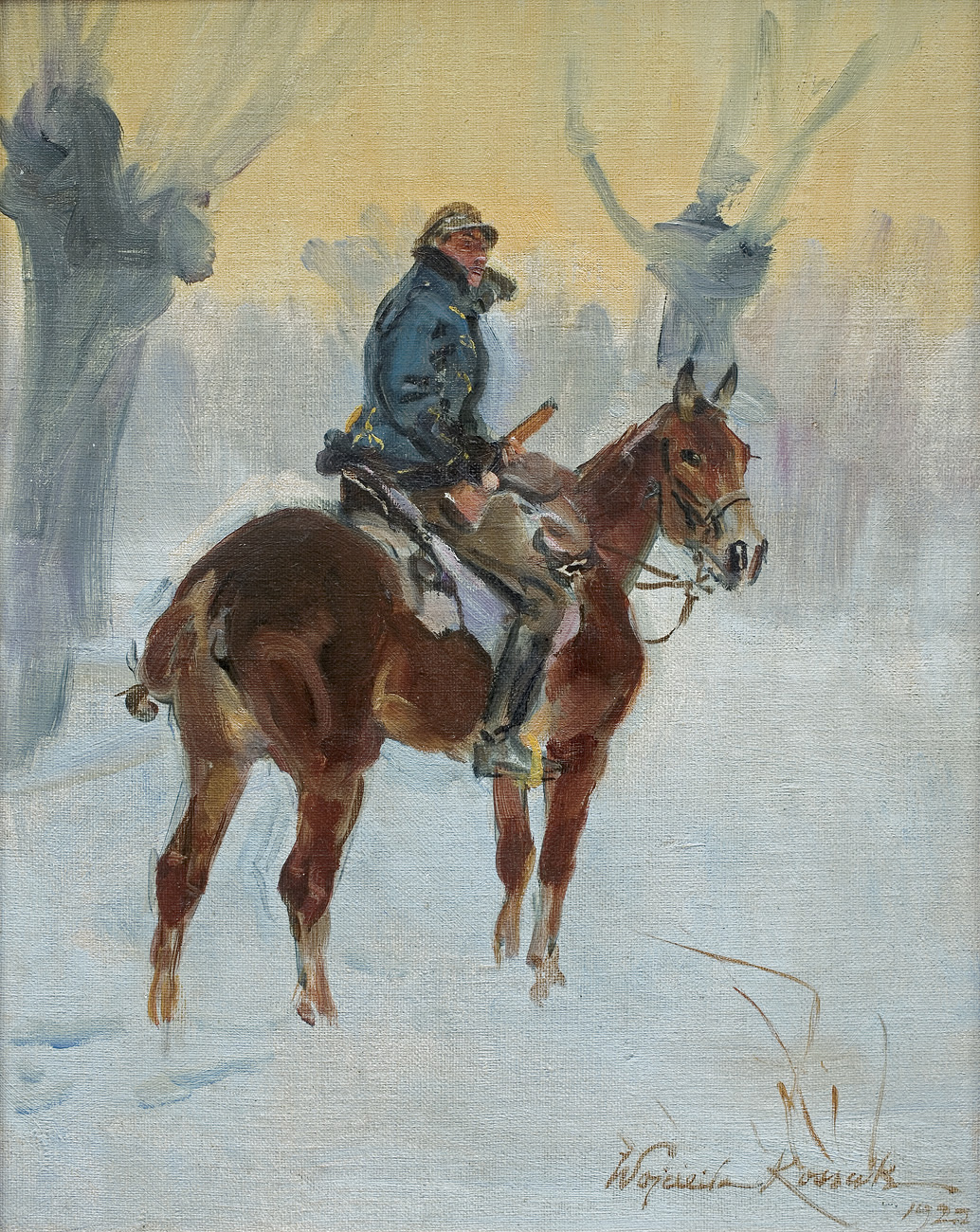 Wojciech Kossak (Paryż 1856 - Kraków 1942 ) – powszechnie znany malarz, postrzegany przede wszystkim jako świetny batalista. Syn i uczeń Juliusza Kossaka kształcił się w krakowskiej Szkole Sztuk Pięknych, w Akademii monachijskiej oraz w Paryżu. W latach 1895-1902 przebywał głównie w Berlinie, pracując dla cesarza Wilhelma II. Wiele podróżował, m.in. do Hiszpanii i Egiptu, gdzie wykonywał szkice do zamierzonych panoram. W późniejszych latach kilkakrotnie wyjeżdżał do Stanów Zjednoczonych wykonując zamówienia portretowe. W 1913 był mianowany profesorem warszawskiej Szkoły Sztuk Pięknych. W latach I wojny światowej pełnił służbę wojskową. Był współautorem panoram: „Racławice” (1893-1894), „Berezyna” (1895-1896), „Bitwa pod piramidami” (1901) oraz szkiców do niezrealizowanej „Somosierry” (1900). Z temperamentem i swobodą tworzył szeroko malowane, dynamiczne sceny batalistyczne, historyczne, rodzajowe oraz liczne portrety. Z upodobaniem malował konie. Jego obrazy, gloryfikujące dawne i współczesne artyście polskie wojsko i bohaterstwo żołnierzy, trafiały do patriotycznych uczuć odbiorców i cieszyły się ogromna popularnością.