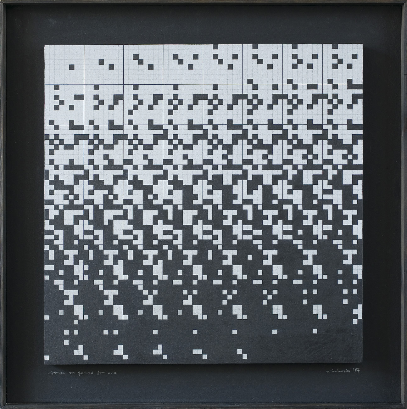 Ryszard Winiarski (Lwów 1936 - Warszawa 2006) ukończył w 1959 Politechnikę Warszawską i podjął studia malarskie w ASP w Warszawie (1960-1966). Pod koniec studiów, w 1965 sformułował własny program artystyczny i zrealizował pierwsze prace z serii pt. „Próby wizualnej prezentacji rozkładów statystycznych“. Otrzymał za nie I nagrodę na Sympozjum Artystów i Naukowców w Puławach w 1966. Jako stałe moduły prac przyjął kwadraty w kolorach czerni i bieli, których kolejnością i rozmieszczeniem rządzi przypadek - rzut kostką do gry, losowanie lub wybór liczb przypadkowych. W 1970 wprowadził do swych prac trzeci wymiar w formie obrazów przestrzennych lub jako iluzję przestrzeni uzyskaną przez wykreślanie perspektywy linearnej. W 1971 powstały pierwsze obrazy z wmontowanymi lustrami. Od 1972 artysta aranżował też „gry“ z udziałem widzów, którzy stosując jego środki i metodę wypełniali płaszczyznę czy pomieszczenie własną „wystawą“. Od ok. 1983 Winiarski włączył do swych prac elementy znaczeniowe, symboliczne i odwołujące się do emocji, jak kształt krzyża, naturalne materiały i zabiegi na nich, np. gięcie (instalacje: Geometria w stanie napięcia, 1984, Czarny kwadrat czyli fruwająca geometria, 1984, Hommage dla Henryka Stażewskiego, 1989). Równolegle artysta od 1960 uprawiał scenografię teatralną, będąc autorem kilkudziesięciu realizacji w tej dziedzinie w teatrach całej Polski. Uczestniczył w wielkiej liczbie wystaw w Polsce i za granicą, w tym: Biennale w Sao Paulo 1969, I i II Biennale des Konstruktivismus, Norymberga 1969 i 1971, Konstrukcja w procesie, Łódź 1981 i Monachium 1985. Zmarł 4 grudnia 2006 w Warszawie.