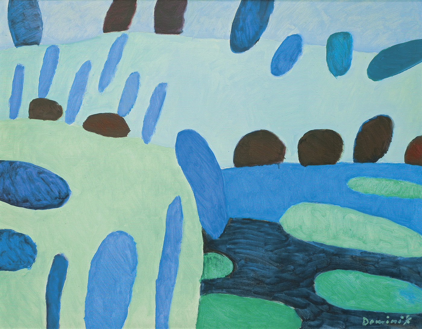 Tadeusz Dominik (Szymanów 14 I 1928 - Warszawa 20 V 2014) studiował na Wydziale Malarstwa ASP w Warszawie pod kierunkiem prof. J.Cybisa (1946-51, dyplom 1953). Od 1951 był pedagogiem na macierzystym Wydziale, początkowo jako asystent Cybisa. Od 1965 prowadził własną pracownię, w 1979 otrzymał tytuł profesora. W 1990 przeszedł na emeryturę. W czasie studiów oddziałały nań - za pośrednictwem osobowości i sztuki Cybisa - idee polskiego koloryzmu, które następnie twórczo i samodzielnie kontynuował. Początkowo tworzył obrazy figuratywne. Debiutował na słynnej wystawie w warszawskim Arsenale w 1955, gdzie zdobył nagrodę. W tym okresie obok malarstwa uprawiał drzeworyt, operujący szerokimi płaszczyznami bieli i czerni (drzeworyty wystawiał m.in. na Biennale w Wenecji w 1956). W drugiej poł. lat 50. zaczął malować obrazy abstrakcyjne, początkowo utrzymane w ekspresyjnej i spontanicznej stylistyce malarstwa informel. W latach 60. wzbogacił swe prace o efekty fakturowe. Niezmienną inspiracją była dla malarza natura, bogactwo i kolorystyka jej form. Pozostał jej wierny do dziś, poddając zmianom sam sposób malowania. Stopniowo rozjaśniał i wygładzał swe kompozycje, wprowadzając efekty dekoracyjne, jak rytmiczne powtórzenia form czy rodzaj malowanych „rastrów“, regularnie znaczących fragmenty kompozycji. Wśród wielu nagród otrzymał m.in. laur „Złotego Grona“ w Zielonej Górze w 1963, Grand Prix Festiwalu Polskiego Malarstwa Współczesnego w Szczecinie w 1968, nagrodę im. George’a Rowney’a w Londynie w 1973 i Nagrodę im. Jana Cybisa w Warszawie w 1973. Równolegle z malarstwem zajmował się gobelinem, ceramiką, również grafiką komputerową.