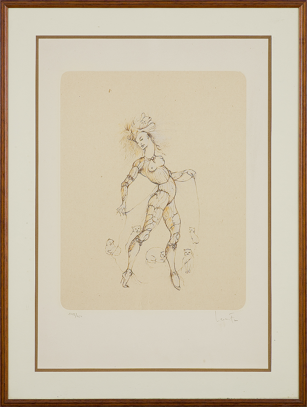 Leonor Fini, z pochodzenia Argentynka, niemal całe życie spędziła we Francji. Nie ukończyła żadnej szkoły artystycznej. W młodości fascynowała się twórczością prerafaelitów, Aubreya Beardsleya i Gustava Klimta. Jej pierwsza wystawa w Paryżu w 1935 zainteresowała surrealistów, poznała Paula Eluarda, Maxa Ernsta, René Magritte’a i Victora Braunera. Odtąd uczestniczyła w niektórych wystawach ruchu surrealistycznego. Interesowała ją biologiczna wegetacja, rytmy przyrody, przemijanie, dla których znajdowała symboliczny wyraz w pracach z późnych lat 40. Od początku aktualnym wątkiem jej twórczości, który od lat 60. zawładnął nią niemal niepodzielnie, był obsesyjny erotyzm, symbolizowany zwłaszcza przez zmysłowe koty-sfinksy. Kocie twarze i sylwetki miały też postaci malowanych przez nią kobiet, nimf, bohaterek mrocznych i wyrafinowanych dramatów. Ważnym wątkiem jej twórczości były portrety o zamglonym, sennym wyrazie. Była żoną Konstantego Jeleńskiego (1922-1987).
