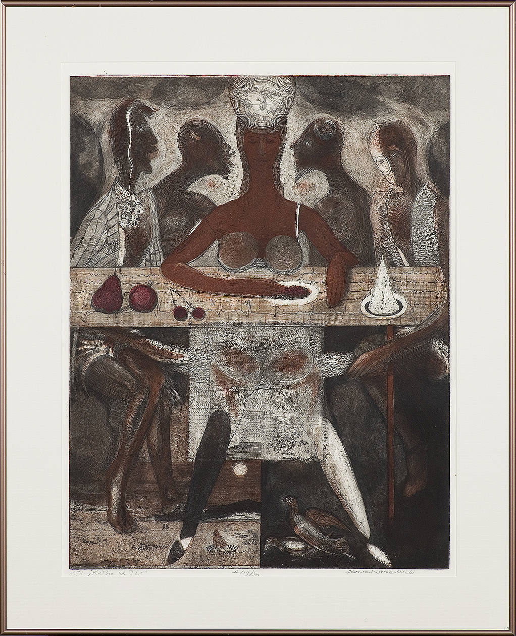 Konrad Srzednicki (Wysokie Mazowieckie 1 XI 1894 – Kraków 8 IV 1993) studiował w prywatnej Szkole Malarstwa i Rysunku Konrada Krzyżanowskiego (1921-1924), następnie w Szkole Sztuk Pięknych w Warszawie (1924-1930, dyplom 1936). W latach 1928-1939 pracował w Katedrze Grafiki Artystycznej macierzystej uczelni. W 1939 został powołany na profesora grafiki w ASP w Krakowie, gdzie – poza latami II wojny światowej – pracował do 1965. Pełnił w tej uczelni funkcje kierownika Katedry Grafiki (1945-1950), rektora (1951-1952), dziekana Wydziału Grafiki (1961-1964). Był członkiem Stowarzyszenia „Ryt” (1929-1939) i grupy „9 grafików” (1952-1960). W 1965 został członkiem honorowym Akademii Sztuk Pięknych we Florencji. Był też członkiem Komitetu Organizacyjnego Międzynarodowego Biennale Grafiki w Krakowie, w latach 1966-1970 jego sekretarzem generalnym. Zdobył liczne nagrody, m. in. na Międzynarodowej Wystawie „Sztuka i Technika”, Paryż 1937, na Światowej Wystawie Grafiki, Londyn 1962, na I Międzynarodowym Biennale Grafiki, Kraków 1966, złoty medal na III Międzynarodowym Salonie Sztuk Plastycznych, Victoria 1968 (Brazylia). Zajmował się malarstwem i grafiką warsztatową (litografia, techniki metalowe, rzadziej drzeworyt). Jego kompozycje, głównie w technikach metalowych, bazowały na doskonałym warsztacie. Artysta chętnie stosował duże formaty i kolor. Figuralne sceny rozgrywają się w odrealnionym świecie idylli, często nawiązują do mitów śródziemnomorskich i dziedzictwa kulturowego świata antycznego.