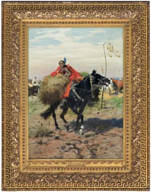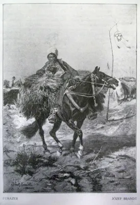Furażer łączy się z większym zespołem prac artysty z – ujętymi na pierwszym planie – konnymi żołnierzami różnej broni i barwy przedstawianymi bądź na tle obozowiska, bądź też na tle oddziałów wojska ciągnący przez równinne pola. Można tu przyto...