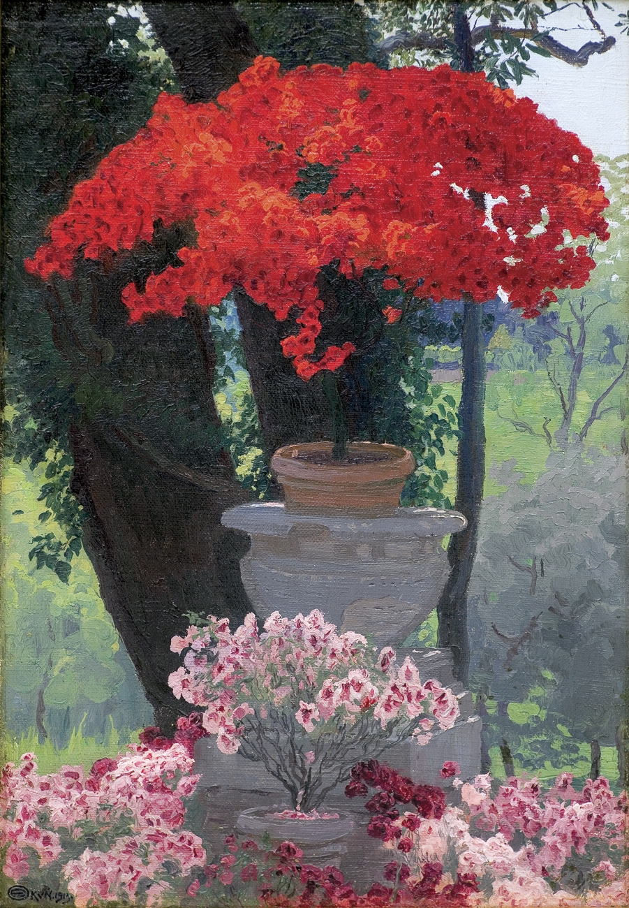 Edward Okuń (Wólka Zerzyńska /obecnie Zerzeńska/ k. Warszawy 1872 - Skierniewice 1945) – malarz, rysownik, ilustrator – studia artystyczne rozpoczął w warszawskiej Klasie Rysunkowej u Wojciecha Gersona. W latach 1891-1893 kształcił się w krakowskiej Szkole Sztuk Pięknych, m.in. u Jana Matejki, od 1893 w Monachium u Antona Ažbe, Stanisława Grocholskiego i Szymona Hollosy’ego. Studia uzupełniał w Paryżu. Od roku 1898 stale mieszkał we Włoszech – w Rzymie, a okresowo także w pobliskim Anticoli Corrado, we Florencji, Sorrento, Amalfi i na Capri. W 1914 podróżował do Egiptu. W roku 1921 wrócił do Warszawy, gdzie w latach 1925-1930 był profesorem Szkoły Sztuk Pięknych. Jeszcze kilkakrotnie wyjeżdżał do Włoch (m.in. w 1928, 1937, 1938), a w latach 1927 oraz 1929-1932 jeździł do Jugosławii, gdzie powstał cykl pejzaży Znad Adriatyku - "Jadran". Malował dekoracyjne, stylizowane portrety, idylliczne pejzaże i kompozycje o wątkach fantastycznych i baśniowych, bliskie symbolizmowi i secesji. Często sam projektował ramy do swoich obrazów, traktując je jako integralną część tych dzieł. Był wybitnym twórcą grafiki książkowej; wykonywał ilustracje, winiety, projekty okładek, inicjały i przerywniki, współpracując m.in. z warszawskim pismem „Chimera”.