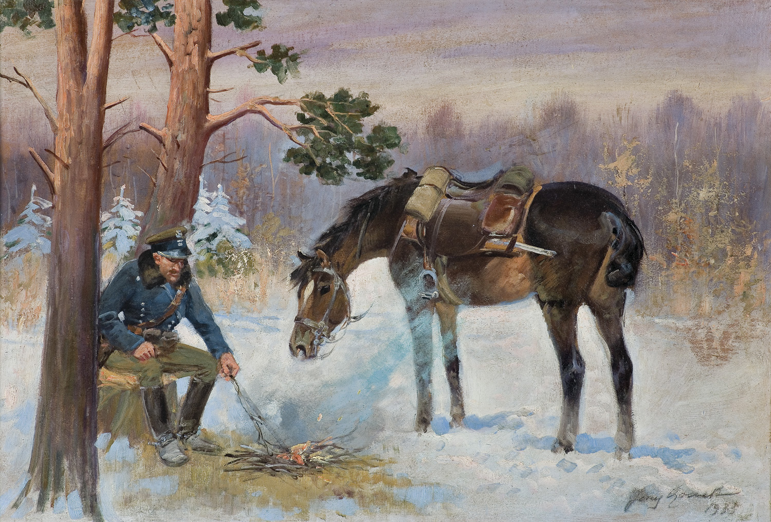 UŁAN Z KONIEM PRZY OGNISKU, 1933