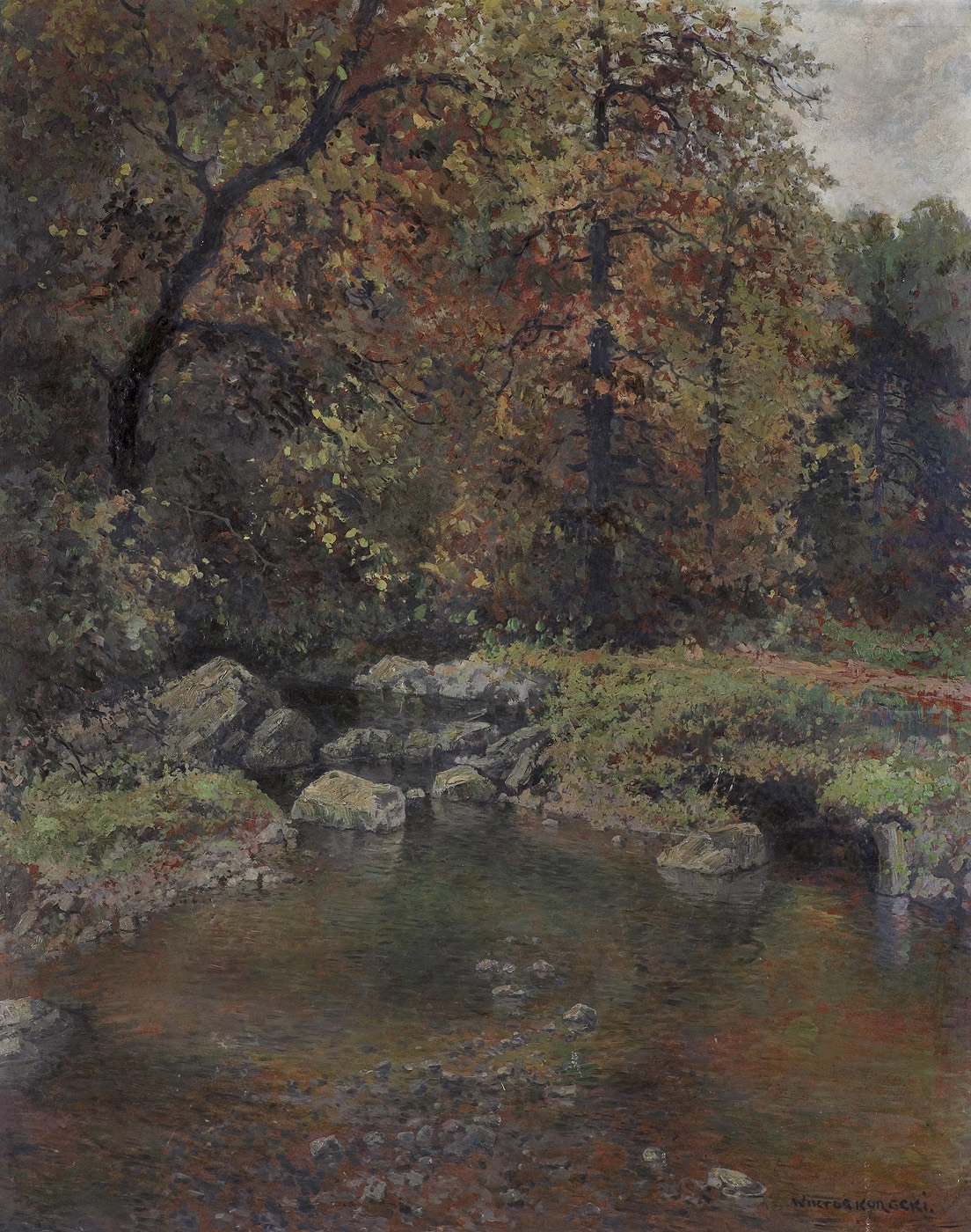 Wiktor Korecki (Kamieniec Podolski 1890 - Komorów k. Warszawy 1980) - malarz pejzażysta - gimnazjum ukończył w Kijowie, tam też studiował w Szkole Rysunkowej Aleksandra Muraszki. Po studiach wrócił do Kamieńca Podolskiego, skąd w roku 1921 wyjechał do Warszawy. Tu miał pracownię na rogu ulic Tamki i Cichej. Niestety zgromadzone tam obrazy spłonęły w czasie powstania 1944 roku. Po powstaniu artysta przebywał w obozie w Pruszkowie skąd trafił do obozu pracy w Lipsku. Do kraju powrócił w roku 1946 i zamieszkał w Komorowie pod Warszawą, a później w Milanówku. Jego nastrojowe krajobrazy emanujące spokojem i pogodą cieszyły się zawsze dużą popularnością. Korecki najczęściej malował pejzaże zimowe z motywem leśnej drogi i strumienia wijącego się wśród śniegów, a obok nich także wiosenne, letnie czy jesienne widoki z Mazowsza.