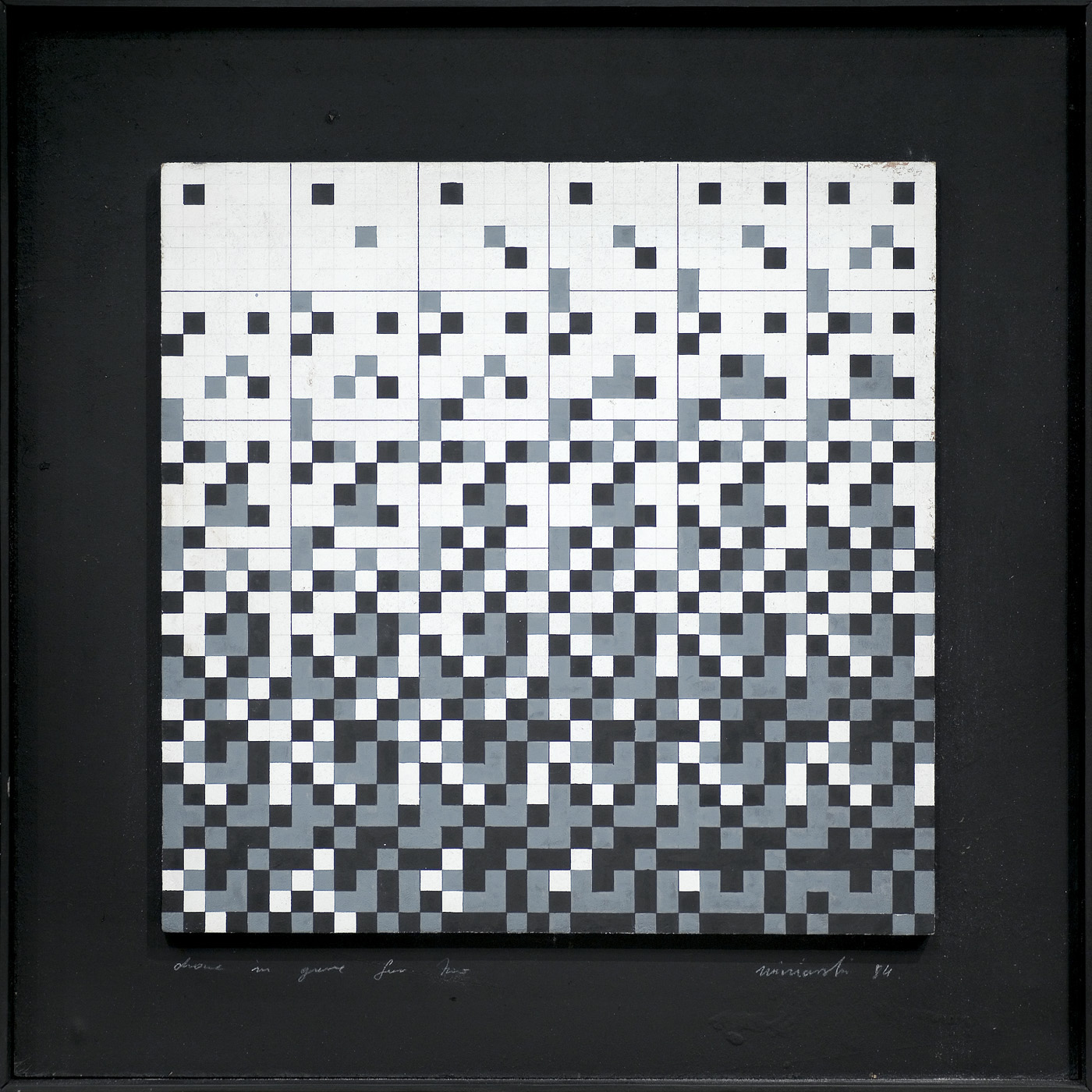 Ryszard Winiarski (Lwów 1936 - Warszawa 2006) ukończył w 1959 Politechnikę Warszawską i podjął studia malarskie w ASP w Warszawie (1960-1966). Pod koniec studiów, w 1965 sformułował własny program artystyczny i zrealizował pierwsze prace z serii pt. „Próby wizualnej prezentacji rozkładów statystycznych“. Otrzymał za nie I nagrodę na Sympozjum Artystów i Naukowców w Puławach w 1966. Jako stałe moduły prac przyjął kwadraty w kolorach czerni i bieli, których kolejnością i rozmieszczeniem rządzi przypadek - rzut kostką do gry, losowanie lub wybór liczb przypadkowych. W 1970 wprowadził do swych prac trzeci wymiar w formie obrazów przestrzennych lub jako iluzję przestrzeni uzyskaną przez wykreślanie perspektywy linearnej. W 1971 powstały pierwsze obrazy z wmontowanymi lustrami. Od 1972 artysta aranżował też „gry“ z udziałem widzów, którzy stosując jego środki i metodę wypełniali płaszczyznę czy pomieszczenie własną „wystawą“. Od ok. 1983 Winiarski włączył do swych prac elementy znaczeniowe, symboliczne i odwołujące się do emocji, jak kształt krzyża, naturalne materiały i zabiegi na nich, np. gięcie (instalacje: Geometria w stanie napięcia, 1984, Czarny kwadrat czyli fruwająca geometria, 1984, Hommage dla Henryka Stażewskiego, 1989). Równolegle artysta od 1960 uprawiał scenografię teatralną, będąc autorem kilkudziesięciu realizacji w tej dziedzinie w teatrach całej Polski. Uczestniczył w wielkiej liczbie wystaw w Polsce i za granicą, w tym: Biennale w Sao Paulo 1969, I i II Biennale des Konstruktivismus, Norymberga 1969 i 1971, Konstrukcja w procesie, Łódź 1981 i Monachium 1985. Zmarł 4 grudnia 2006 w Warszawie.