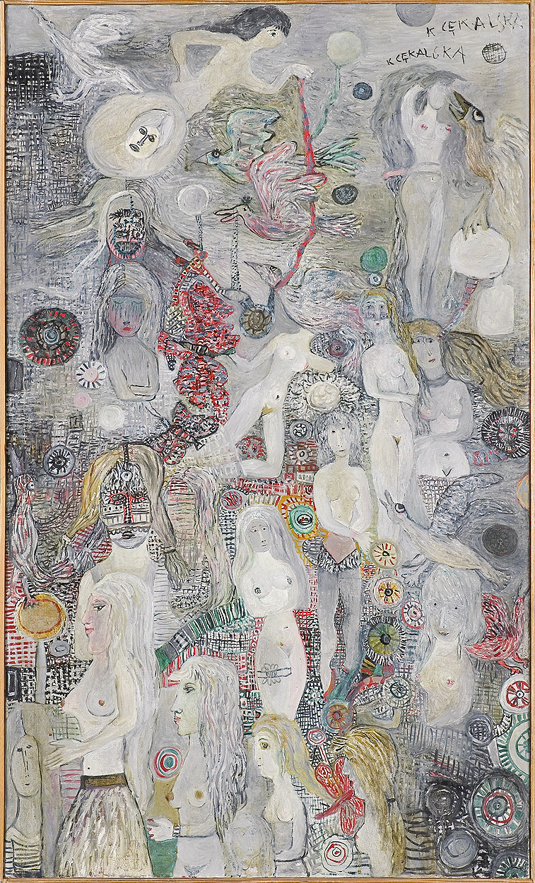 „Malarstwo Krystyny Cękalskiej jest bliskie kulturze polskiego koloryzmu. Jest ono jednak inne, niepodobne do ogólnie przyjętych szablonów, rozpoznawalne, pełne poezji, soczystych barw. Czerpie natchnienie z innego świata, ulega fascynacjom odległym w czasie i niespotykanym w miejskim życiu. Niewyczerpane źródło natchnienia znajduje w sztuce naiwnej i sztuce ludowej. Kolorystyka i kompozycja obrazów mają w sobie coś z aury tajemniczości dawnych ikon wschodnich.”