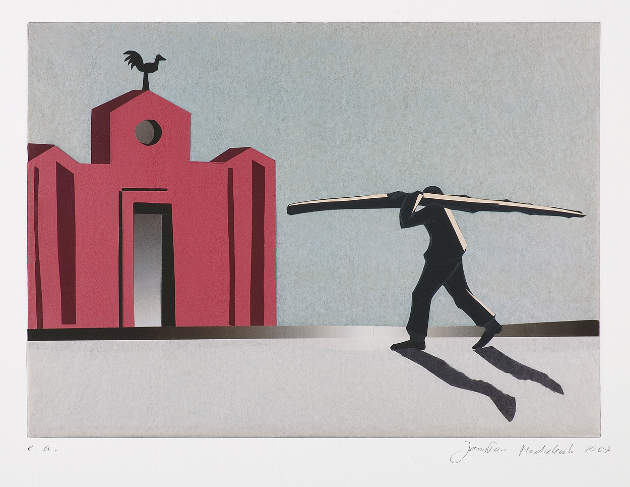 Jarosław Modzelewski (Warszawa 1955, mieszka w Warszawie) studiował malarstwo w ASP w Warszawie w latach 1975-1980, uzyskując dyplom w pracowni Stefana Gierowskiego. Od 1982 pracuje jako pedagog na macierzystym wydziale. W 1982 był współzałożycielem „Gruppy”, najważniejszego ugrupowania nurtu nowej ekspresji lat 80., działającego do 1992. W latach 1991-1996 wspólnie z Markiem Sobczykiem prowadził prywatną Szkołę Sztuki w Warszawie. Od wielu lat współpracuje z Galerią Zderzak w Krakowie. W początkowym okresie twórczości skłaniał się ku abstrakcji, wykorzystywał uproszczone znaki i emblematy oraz sylwetki odbite z szablonu. W 1985 namalował cykl oparty na ilustracjach do podręczników języka rosyjskiego, obrazujący proste czynności, których czasownikowe określenia stanowią tytuły prac. W 1986-1989 powstawały obrazy utrzymane w konwencji realistycznej, jednak zarazem o surrealnej atmosferze uzyskiwanej różnymi metodami, np. przez dublowanie figur, ukazywanie postaci w sytuacji niepewności czy zagrożenia, zabiegi z przestrzenią. W grupie obrazów z 1988 artysta rezygnuje z postaci ludzkiej na rzecz wyjątkowego nasycenia emocją samej przestrzeni pejzaży i wnętrz. Około 1990 wraca do kompozycji akcentujących czynności wykonywane przez postaci, które często umieszczone są w pustej, zaledwie zasugerowanej, acz dominującej przestrzeni. Odrealnienia i monumentalności dodaje tym obrazom płaskie i rozległe kładzenie koloru.
