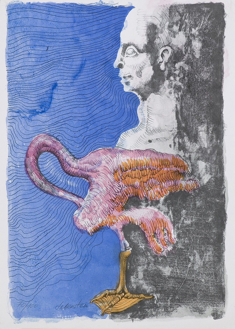 Jan Lebenstein (Brześć Litewski 1930 - Kraków 1999) w latach 1948-1954 studiował malarstwo w ASP w Warszawie pod kierunkiem prof. Eugeniusza Eibischa i Artura Nachta-Samborskiego. W 1955 wziął udział w wystawie w warszawskim Arsenale. Zaprzyjaźniony w czasie studiów z Mironem Białoszewskim, swą pierwszą wystawę indywidualną pokazał w 1956 w Teatrze na Tarczyńskiej. W 1959 zdobył Grand Prix de la Ville de Paris na I Biennale Młodych w Paryżu i w tym roku przeniósł się na stałe do Paryża. Po seriach "figur kreślonych" (na papierze milimetrowym) i "figur hieratycznych" z lat 1955-1958 maluje cykl "figur osiowych" (1958-1962), które wystawia w Paryżu i USA. Równolegle w 1960 zaczyna rysowane "karnety", rodzaj dziennika, który w przyszłości dostarczy motywów wykorzystanych w obrazach. W latach 1964-1965 maluje "Bestiarium", cykl fakturowych, archaizowanych stworów przypominających prehistoryczne wykopaliska. Bezpośrednio po nich wprowadza do swych obrazów postaci ludzkie i fantastyczne, odgrywające sceny ni to mitologiczne, ni to ze snu, często przesycone erotyką. W 1970 projektuje witraże dla Centre du Dialogue w Paryżu. W W 1971 otrzymuje obywatelstwo francuskie 1974 powstają gwasze inspirowane Folwarkiem zwierzęcym George'a Orwella. W latach 1976-1989 tworzy wyłącznie w technice gwaszu i pastelu, podejmując tematykę mitologiczną i zaczerpniętą z Biblii: cykle ilustracji do Księgi Hioba (wyd. 1979) i do Apokalipsy (wyd. 1986) w nowych przekładach Czesława Miłosza. W 1989 powraca do malarstwa olejnego (cykl "Pergamon"). Artysta otrzymał m. in. nagrodę Fundacji im. Alfreda Jurzykowskiego w 1976, Nagrodę Muzeum Archidiecezji Warszawskiej w 1985, Nagrodę im. Jana Cybisa w 1987.