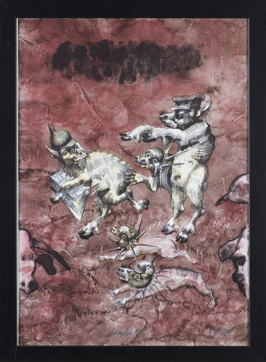 Jan Lebenstein (Brześć Litewski 1930 - Kraków 1999) w latach 1948-1954 studiował malarstwo w ASP w Warszawie pod kierunkiem prof. Eugeniusza Eibischa i Artura Nachta-Samborskiego. W 1955 wziął udział w wystawie w warszawskim Arsenale. Zaprzyjaźniony w czasie studiów z Mironem Białoszewskim, swą pierwszą wystawę indywidualną pokazał w 1956 w Teatrze na Tarczyńskiej. W 1959 zdobył Grand Prix de la Ville de Paris na I Biennale Młodych w Paryżu i w tym roku przeniósł się na stałe do Paryża. Po seriach "figur kreślonych" (na papierze milimetrowym) i "figur hieratycznych" z lat 1955-1958 maluje cykl "figur osiowych" (1958-1962), które wystawia w Paryżu i USA. Równolegle w 1960 zaczyna rysowane "karnety", rodzaj dziennika, który w przyszłości dostarczy motywów wykorzystanych w obrazach. W latach 1964-1965 maluje "Bestiarium", cykl fakturowych, archaizowanych stworów przypominających prehistoryczne wykopaliska. Bezpośrednio po nich wprowadza do swych obrazów postaci ludzkie i fantastyczne, odgrywające sceny ni to mitologiczne, ni to ze snu, często przesycone erotyką. W 1970 projektuje witraże dla Centre du Dialogue w Paryżu. W W 1971 otrzymuje obywatelstwo francuskie 1974 powstają gwasze inspirowane Folwarkiem zwierzęcym George'a Orwella. W latach 1976-1989 tworzy wyłącznie w technice gwaszu i pastelu, podejmując tematykę mitologiczną i zaczerpniętą z Biblii: cykle ilustracji do Księgi Hioba (wyd. 1979) i do Apokalipsy (wyd. 1986) w nowych przekładach Czesława Miłosza. W 1989 powraca do malarstwa olejnego (cykl "Pergamon"). Artysta otrzymał m. in. nagrodę Fundacji im. Alfreda Jurzykowskiego w 1976, Nagrodę Muzeum Archidiecezji Warszawskiej w 1985, Nagrodę im. Jana Cybisa w 1987.