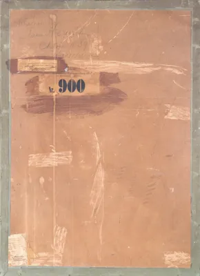 - poniżej nalepka (druk, maszynopis, tusz): 41491 Wyczółkowski Leon 41491 | Tytuł Mnich wykonanie pastel | Cena Wł. M. Heurichowa Data | Chłodna 39 a