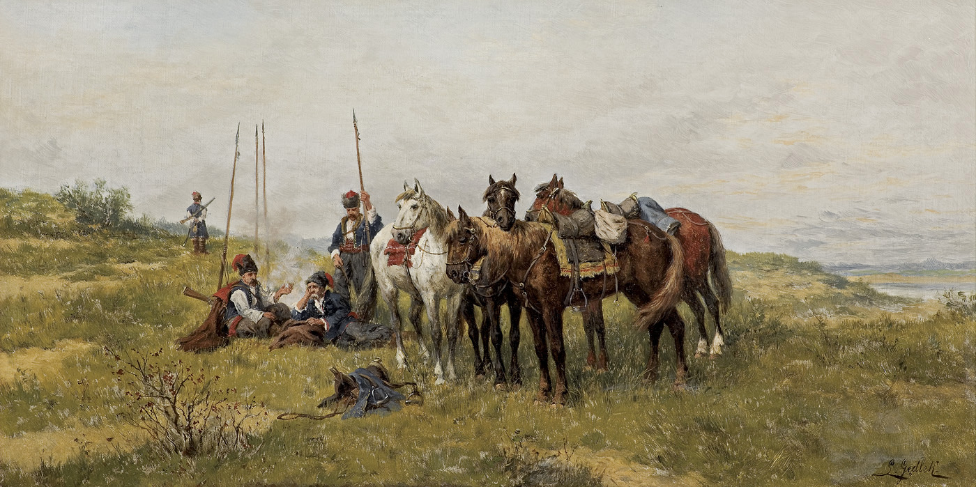 Ludwik Gędłek (Kraków 1847 - Wiedeń 1904) rozpoczął studia artystyczne w krakowskiej Szkole Sztuk Pięknych pod kierunkiem Władysława Łuszczkiewicza, a w latach 1872-1877 kontynuował je w Akademii wiedeńskiej u Eduarda Lichtenfelsa i Carla Wurzingera. Już w roku 1863 debiutował na wystawie w krakowskim TPSP, gdzie później wystawiał jeszcze kilkakrotnie. Stale mieszkał w Wiedniu, skąd wysyłał obrazy także na wystawy do TPSP we Lwowie, do Salonu Aleksandra Krywulta w Warszawie oraz do Drezna. Malował przede wszystkim sceny rodzajowe i batalistyczne z częstym motywem koni, a także krajobrazy, głównie z okolic Krakowa. Obrazy artysty znajdują się, m.in. w Muzeum Narodowym w Warszawie, Lwowskiej Galerii Obrazów i Polskim Muzeum w Chicago