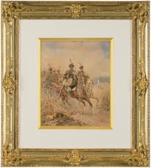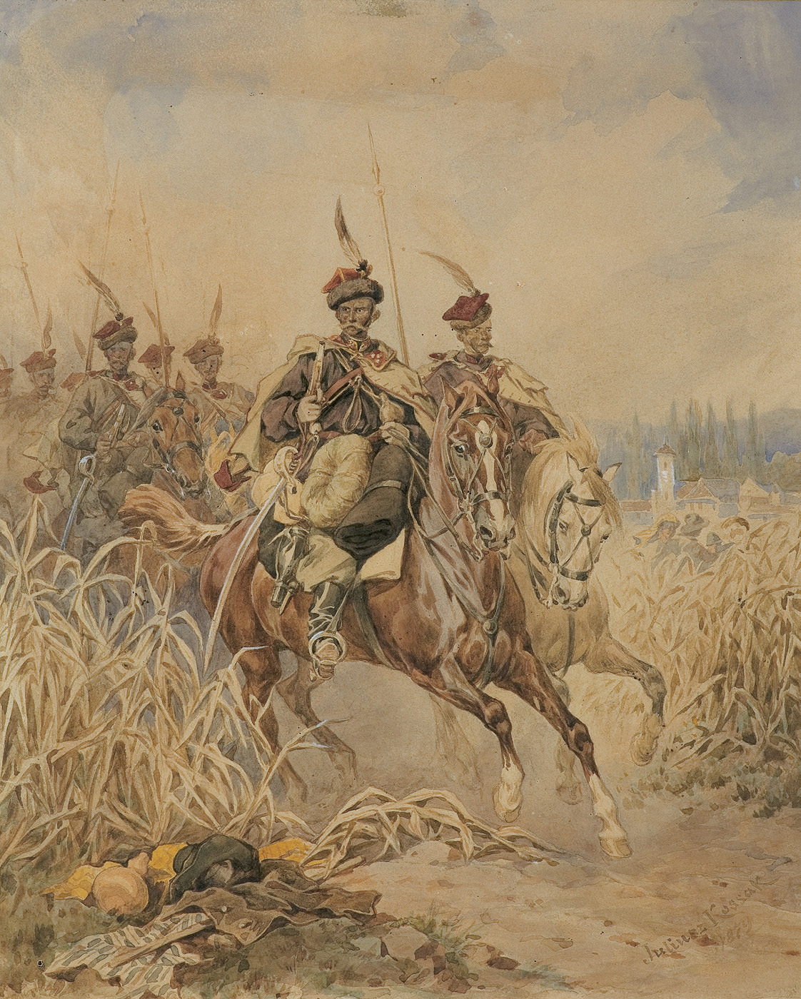 Juliusz Kossak (Wiśnicz 1824 - Kraków 1899) - malarz i ilustrator - był jednym z najpopularniejszych artystów polskich 2. połowy XIX wieku. Naukę rysunku i malarstwa rozpoczął we lwowskiej pracowni Jana Maszkowskiego; później wiele rysował z natury odwiedzając majątki szlacheckie na Ukrainie, Podolu i Wołyniu. W roku 1852 był w Wiedniu, na Węgrzech i w Petersburgu, a następnie zamieszkał na stałe w Warszawie. Lata 1856-1860 spędził w Paryżu, gdzie przyjaźnił się z Horacem Vernetem. Powróciwszy do Warszawy w latach 1862-1868 był kierownikiem artystycznym „Tygodnika Ilustrowanego”. W roku 1869 przeniósł się na stałe do Krakowa, skąd wyjeżdżał jeszcze do Monachium, by malować w atelier batalisty Franza Adama. Kossak był przede wszystkim znakomitym akwarelistą; rzadziej posługiwał się techniką olejną. Malował obrazy historyczne i batalistyczne, sceny rodzajowe ilustrujące życie i tradycje dworu szlacheckiego oraz obyczaje polskiego ludu. Ale prawdziwymi bohaterami jego obrazów były konie, których ruch, temperament, charakter i indywidualność potrafił po mistrzowsku przedstawić. Był także autorem wielu ilustracji do czasopism i książek, trafiającym bezbłędnie tak w klimat utworów literackich, jak i w tęsknoty i potrzeby odbiorców - czytelników Pieśni o ziemi naszej Wincentego Pola, Trylogii Henryka Sienkiewicza, Pana Tadeusza i poematów Adama Mickiewicza.