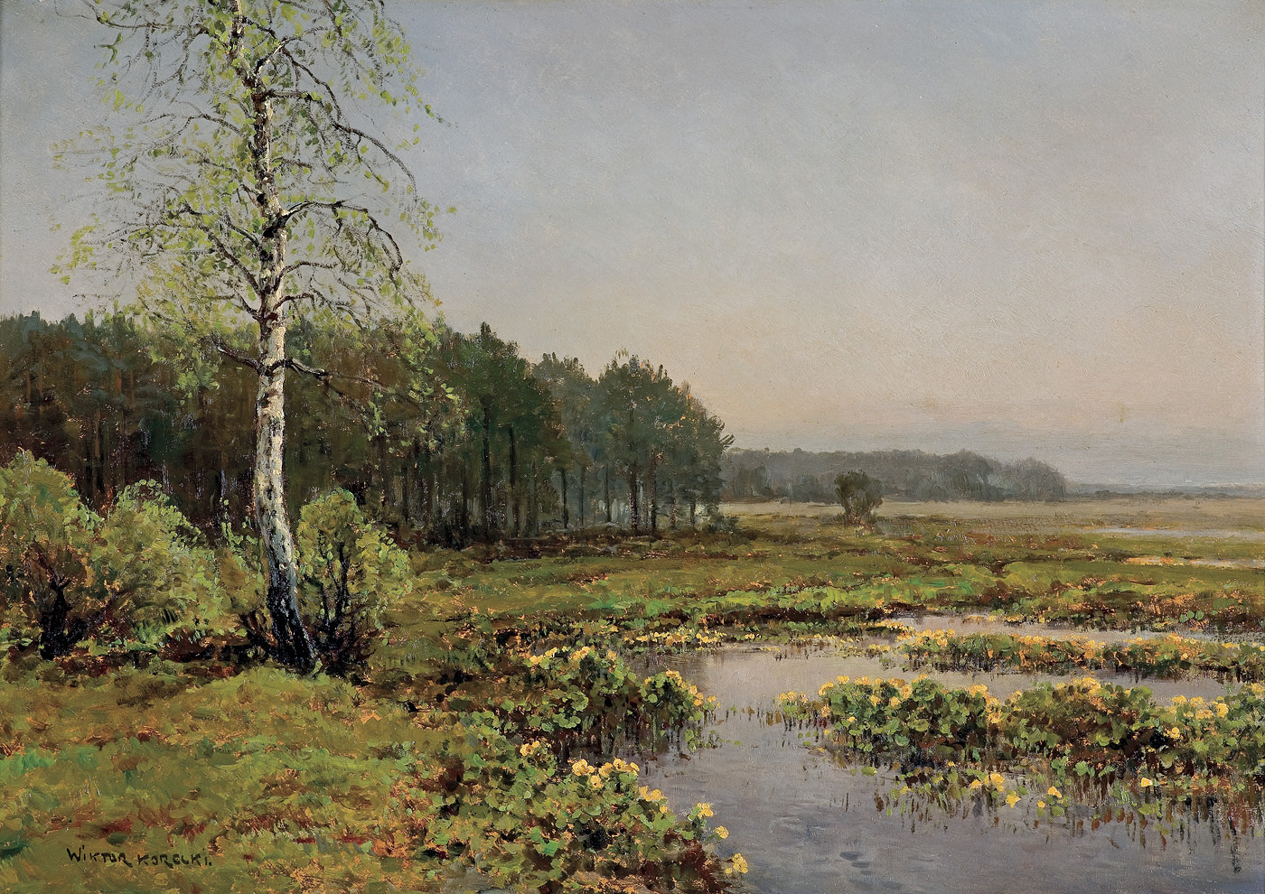 Wiktor Korecki (Kamieniec Podolski 1890 - Komorów k. Warszawy 1980) - malarz pejzażysta - gimnazjum ukończył w Kijowie, tam też studiował w Szkole Rysunkowej Aleksandra Muraszki. Po studiach wrócił do Kamieńca Podolskiego, skąd w roku 1921 wyjechał do Warszawy. Tu miał pracownię na rogu ulic Tamki i Cichej. Niestety zgromadzone tam obrazy spłonęły w czasie powstania 1944 roku. Po powstaniu artysta przebywał w obozie w Pruszkowie skąd trafił do obozu pracy w Lipsku. Do kraju powrócił w roku 1946 i zamieszkał w Komorowie pod Warszawą, a później w Milanówku. Jego nastrojowe krajobrazy emanujące spokojem i pogodą cieszyły się zawsze dużą popularnością. Korecki najczęściej malował pejzaże zimowe z motywem leśnej drogi i strumienia wijącego się wśród śniegów, a obok nich także wiosenne, letnie czy jesienne widoki z Mazowsza.