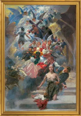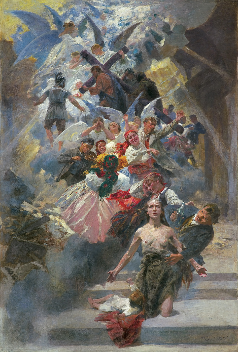 Zdzisław Jasiński (Warszawa 1863 – Warszawa 1932) pochodził z rodziny o artystycznych skłonnościach i tradycjach; ojciec prowadził firmę dekoratorską, brat był rzeźbiarzem. Naukę malarstwa rozpoczął pod okiem Wojciecha Gersona w warszawskiej Klasie Rysunkowej. Następnie studiował w Szkole Sztuk Pięknych w Krakowie u profesorów Leopolda Loefflera, Feliksa Szynalewskiego i Floriana Cynka, odwiedzając też pracownię Jana Matejki. Od 1885 kształcił się w Monachium pod kierunkiem Otto Seitza i Aleksandra Wagnera. W 1889 na wystawie akademickiej otrzymał wyróżnienie za Chorą matkę, obraz który w 1891 ponownie nagrodzono na międzynarodowej wystawie w Berlinie (złoty medal II klasy). Pokazywane na wielu wystawach obrazy artysty kilkakrotnie jeszcze nagradzano dyplomami i medalami, np. Nabożeństwo świąteczne nagrodzono na wystawie w warszawskiej Zachęcie (1891), na Światowej Wystawie w Chicago (1893) oraz na Międzynarodowej Wystawie w San Francisco i Los Angeles (1894), a Portret Antoniego Maleckiego uhonorowano medalem na Powszechnej Wystawie w Paryżu (1900). Po powrocie do kraju w roku 1893 artysta zamieszkał w Warszawie, włączając się w nurt polskiego życia artystycznego. Zajmował się wówczas także monumentalnym malarstwem dekoracyjnym; był m.in. autorem plafonu w Filharmonii Warszawskiej, polichromii w katedrze we Włocławku i kolegiacie w Kaliszu, malowideł w pałacyku w Białowieży i pałacach Petersburga. W 1897 podróżował do Włoch, a od 1904 mieszkał we własnym majątku w Przyłęku k. Garwolina, by w 1910 powrócić do Warszawy. W roku 1921 był jednym ze współzałożycieli stowarzyszenia artystycznego „Pro Arte”. Malował realistyczne sceny rodzajowe wyrosłe z tradycji szkoły monachijskiej, obrazy o treściach symbolicznych (Chmura karmicielka, Bańki mydlane) i alegorycznych (Rok 1920) oraz portrety, akty, kwiaty i pejzaże. Po roku 1900 tonacja jego obrazów ulega rozjaśnieniu, w pełni ujawniając wielką wrażliwość artysty na kolor.