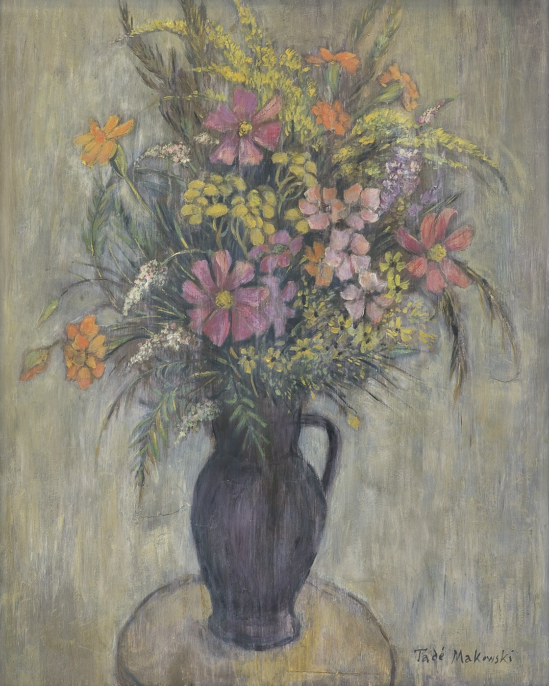 Tadeusz Makowski (Oświęcim 1882 - Paryż 1932) - malarz, grafik; w latach 1903-1908 studiował malarstwo u Józefa Mehoffera i Jana Stanisławskiego w krakowskiej Akademii Sztuk Pięknych. W czasie studiów podróżował do Wenecji, po ich ukończeniu wyjechał do Paryża i tam pozostał na stałe. W czasie I wojny światowej przebywał w Bretanii, przyjaźniąc się z Władysławem Ślewińskim. W 1916 wrócił do Paryża, skąd wyjeżdżał do Owernii, Holandii i Belgii. W początkach twórczości inspirował się malarstwem Pierra Puvis de Chavannes’a. W latach 1912-1915 w jego obrazach widoczna jest fascynacja kubizmem, a później także inspiracje dawnym malarstwem holenderskim i polską sztuką ludową. Z czasem artysta coraz bardziej upraszczał formę, dochodząc do stworzenia „własnego systemu znaków plastycznych“. Szczególnie często malował dzieci, w okresie późniejszym także starych ludzi, a zawsze chętnie kwiaty i pejzaże. Wiele wystawiał we Francji, natomiast w kraju nie był specjalnie znany. Jedyna większa wystawa jego prac odbyła się w roku 1936 w warszawskim Instytucie Propagandy Sztuki. Dziś jest uznany za jednego z najciekawszych malarzy polskich okresu dwudziestolecia międzywojennego. Jego twórczość, wnikliwie opracowana i omówiona w opracowaniach prof. W. Jaworskiej, prezentowana była w 1960 na wystawie monograficznej w Muzeum Narodowym w Warszawie, na wystawie w 1990/1991 prezentowanej w Bochum i Muzeum Narodowym w Warszawie i na ostatniej wystawie w Muzeum Śląskim w Katowicach i ponownie w Muzeum w Warszawie.