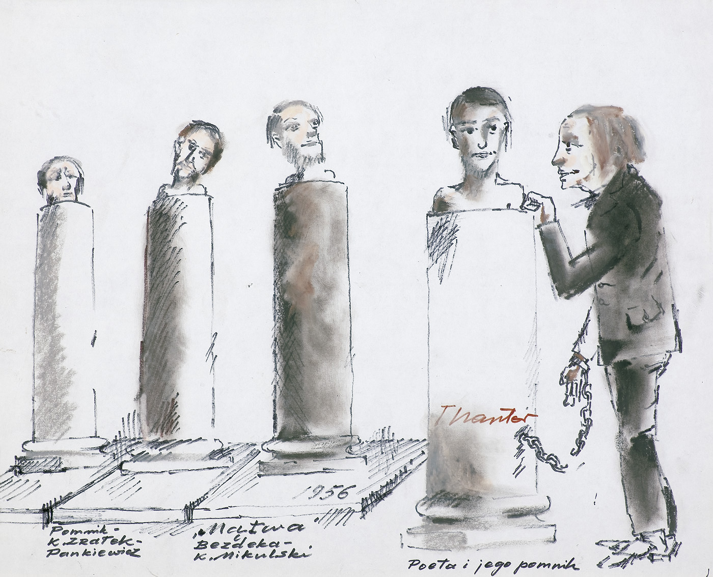 Tadeusz Kantor (Wielopole Skrzyńskie 1915 - Kraków 1990) studiował scenografię w ASP w Krakowie w latach 1934-1939. W 1942 założył Teatr Podziemny, który działał do 1944, dając dwa spektakle: "Balladynę" i "Powrót Odysa". W trakcie prac nad spektaklami zawiązało się grono artystów, którzy w 1945 utworzyli pod wodzą Kantora „Grupę Młodych Plastyków“. Ta z kolei stała się zalążkiem zarówno eksperymentalnego teatru Cricot 2 (utworzonego w 1955), jak i drugiej „Grupy Krakowskiej“ (utworzonej w 1957). W 1947 Kantor przebywał na rocznym stypendium w Paryżu, po powrocie był jednym z organizatorów I Wystawy Sztuki Nowoczesnej, Kraków 1948/49. W latach 1950-1954 nie uczestniczył w wystawach. Od 1955 jego twórczość biegła dwutorowo. Z jednej strony działał jako malarz, twórca „ambalaży“, od 1965 happeningów, z drugiej - poświęcał się pracy nad kolejnymi spektaklami Cricot 2, z których każdy był wydarzeniem artystycznym, zwłaszcza od lat 70.: "Umarła klasa" (premiera 1975), "Wielopole, Wielopole" (1980), "Niech sczezną artyści" (1985), "Nigdy tu już nie powrócę" (1988); zmarł po ostatniej próbie spektaklu "Dzisiaj są moje urodziny" (premiera 1991). Współpracował stale z galeriami: Krzysztofory w Krakowie (gdzie również miał siedzibę teatr Cricot 2) i Foksal w Warszawie. Od 1979 wraz z teatrem Cricot 2 przebywał głównie we Florencji. Był teoretykiem sztuki i teatru, autorem wielu manifestów. Uczestniczył w wystawach miedzynarodowych najwyższej rangi, jak Documenta w Kassel (1959, 1965), Biennale w Wenecji (1960), Biennale w Sao Paulo (1967). Otrzymał m.in. Prix Rembrandt Fundacji Goethego, Bazylea 1978, Medal „Arts et Lettres“ Ministra Kultury Francji 1982, nagrodę Fundacji im. Alfreda Jurzykowskiego, Nowy Jork 1982 i wiele nagród teatralnych.