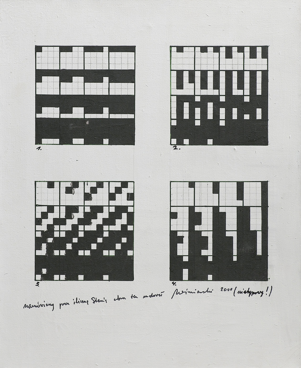Ryszard Winiarski (Lwów 1936 - Warszawa 2006) ukończył w 1959 Politechnikę Warszawską i podjął studia malarskie w ASP w Warszawie (1960-1966). Pod koniec studiów, w 1965 sformułował własny program artystyczny i zrealizował pierwsze prace z serii pt. „Próby wizualnej prezentacji rozkładów statystycznych“. Otrzymał za nie I nagrodę na Sympozjum Artystów i Naukowców w Puławach w 1966. Jako stałe moduły prac przyjął kwadraty w kolorach czerni i bieli, których kolejnością i rozmieszczeniem rządzi przypadek - rzut kostką do gry, losowanie lub wybór liczb przypadkowych. W 1970 wprowadził do swych prac trzeci wymiar w formie obrazów przestrzennych lub jako iluzję przestrzeni uzyskaną przez wykreślanie perspektywy linearnej. W 1971 powstały pierwsze obrazy z wmontowanymi lustrami. Od 1972 artysta aranżował też „gry“ z udziałem widzów, którzy stosując jego środki i metodę wypełniali płaszczyznę czy pomieszczenie własną „wystawą“. Od ok. 1983 Winiarski włączył do swych prac elementy znaczeniowe, symboliczne i odwołujące się do emocji, jak kształt krzyża, naturalne materiały i zabiegi na nich, np. gięcie (instalacje: Geometria w stanie napięcia, 1984, Czarny kwadrat czyli fruwająca geometria, 1984, Hommage dla Henryka Stażewskiego, 1989). Równolegle artysta od 1960 uprawiał scenografię teatralną, będąc autorem kilkudziesięciu realizacji w tej dziedzinie w teatrach całej Polski. Uczestniczył w wielkiej liczbie wystaw w Polsce i za granicą, w tym: Biennale w Sao Paulo 1969, I i II Biennale des Konstruktivismus, Norymberga 1969 i 1971, Konstrukcja w procesie, Łódź 1981 i Monachium 1985. Zmarł 4 grudnia 2006 w Warszawie.
