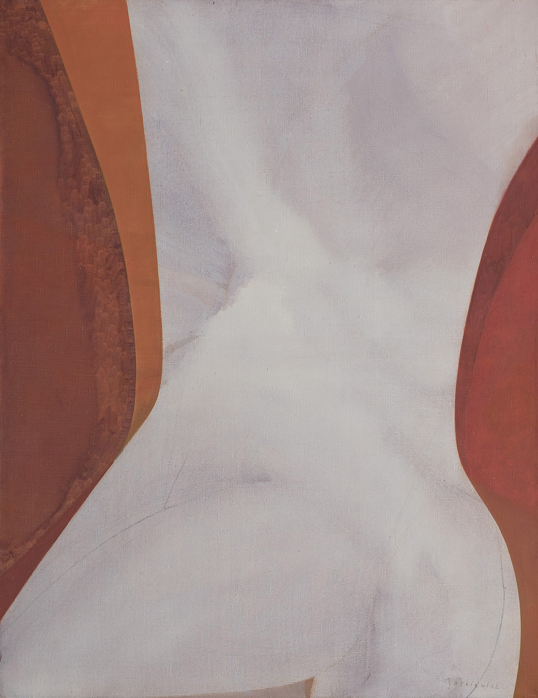 Władysław Jackiewicz (Podbrodzie na Wileńszczyźnie 17 II 1924, Gdańsk 30 III 2016) studiował na Wydziale Malarstwa w Państwowej Wyższej Szkole Sztuk Plastycznych w Gdańsku (z siedzibą w Sopocie). Dyplom otrzymał w pracowni prof. Artura Nachta-Samborskiego w 1952. W latach 1959-1981 pracował w macierzystej uczelni, przechodząc wszystkie szczeble kariery akademickiej od asystenta do profesora. W latach 1969-1981 był rektorem. Był członkiem i działaczem ZPAP, a po jego rozwiązaniu Związku Polskich Malarzy i Grafików, w którym w latach 1985-1989 pełnił funkcję prezesa. Był członkiem Narodowej Rady Kultury w latach 1986-1990. Otrzymał wiele nagród i odznaczeń państwowych. Miał kilkadziesiąt wystaw indywidualnych w kraju i za granicą, uczestniczył w licznych wystawach zbiorowych, m.in. w Wystawie Młodej Plastyki w Arsenale, Warszawa 1955, w kolejnych edycjach Ogólnopolskiej Wystawy Młodego Malarstwa, Rzeźby i Grafiki w Sopocie w 1957, 1958, 1959, IV Sympozjum Złotego Grona w Zielonej Górze 1969 (Grand Prix), XLIII Biennale Sztuki w Wenecji 1988. W latach 50. uprawiał malarstwo zakorzenione w tradycji kolorystycznej. Od 1973 tworzył jeden cykl malarski pt. „Ciało“, rozwijając w nim na niezliczone sposoby temat aktu. Kształty postaci kadrował tak, że w polu kompozycji pozostawał sam tors, zazwyczaj pozbawiony szczegółów anatomicznych. Malował rozjaśnione, syntetyczne sylwety, wykorzystując efekt prześwitywania gruntu barwnego przez cienką warstwę laserunku.