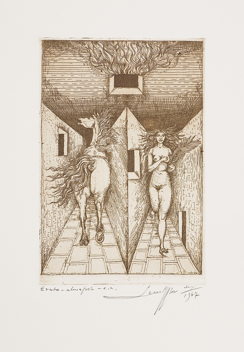 Leszek Rózga (Zgierz 1924 - Łódź 2015) - artysta grafik. W latach 1940-1945 przebywał na robotach w Niemczech, gdzie po zakończeniu wojny pracował w teatrze amatorskim i uczył się prywatnie malarstwa (1945-1947). Studiował w Państwowej Wyższej Szkole Sztuk Plastycznych w Łodzi (1948-1951) i na Wydziale Grafiki Propagandowej w Katowicach - filii ASP w Krakowie, gdzie obronił dyplom w 1954. W latach 1967-1994 był wykładowcą (od 1979 profesorem) w uczelni łódzkiej, gdzie stworzył szkołę metaforycznej, ekspresyjnej sztuki graficznej. Brał udział w licznych wystawach w kraju i za granicą, zdobywając często nagrody. Był również laureatem wielu nagród państwowych, resortowych, regionalnych itp., jak: Nagrody Ministra Kultury i Sztuki I st. 1981, 1986, 1994, Nagroda Woj. Łódzkiego 1972, Nagroda Miasta Łodzi 1985. Działał w ZPAP, był m. in. członkiem Rady Artystycznej Zarządu Głównego 1974-1976. Początkowo zajmował się głównie malarstwem, rysunkiem i monotypią, tworząc nastrojowe widoki miejskie. Od 1960 skupił się na grafice warsztatowej (głównie w technikach metalowych). W latach 70. wprowadzał do swych kompozycji werystycznie odwzorowane rośliny i owoce, inskrypcje, cytaty ze sztuki klasycznej.