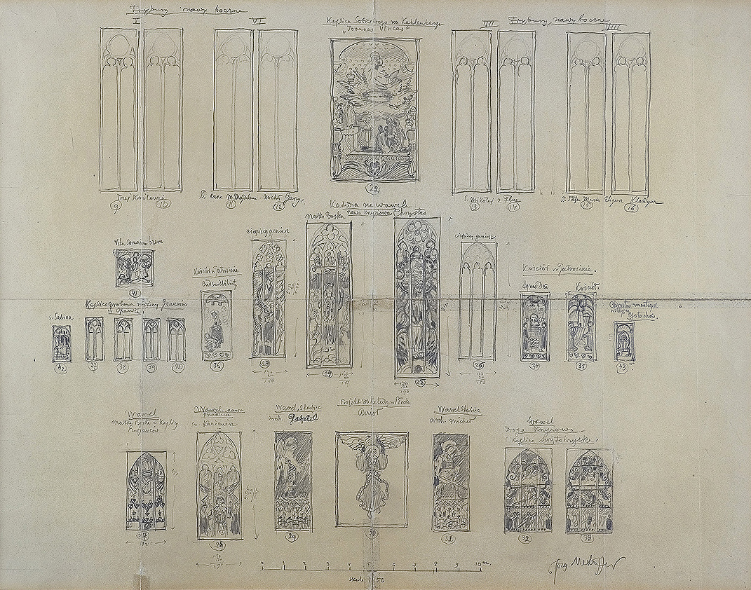 Józef Mehoffer (Ropczyce 1869-Wadowice 1946) - malarz, grafik, scenograf i pedagog; obok Stanisława Wyspiańskiego był najwybitniejszym polskim twórcą witraży i polichromii. Uczeń Jana Matejki i uczelni paryskich - Ecolé des Beaux Arts i Accadémie Colarossi - swą drogę twórczą rozpoczął w latach 1889-1891 od pracy nad polichromią Kościoła Mariackiego w Krakowie (pod kierunkiem Matejki). W roku 1895 otrzymał I nagrodę na międzynarodowym konkursie na witraże do kolegiaty we Fryburgu w Szwajcarii (ich realizacja trwała aż do 1934). W latach następnych otrzymywał różne inne zamówienia na witraże i polichromie, m.in. dla katedry na Wawelu i w Płocku, katedry Ormiańskiej we Lwowie, dla kościołów w Opawie, Onnes w Szwajcarii, w Jutrosinie, we Włocławku czy Przemyślu (nie wszystkie zrealizowane). Był wybitnym reprezentantem sztuki secesji. Tworzył dekoracyjnie traktowane portrety, w tym autoportrety i portrety żony, a także obrazy o zabarwieniu rodzajowym, które w latach 1895-1917 zyskiwały wymowę kompozycji symbolicznych. Malował także pejzaże łączące secesyjną dekoracyjność ze zdobyczami impresjonizmu. Z mistrzowską biegłością posługiwał się różnymi technikami - olejem, temperą, akwarelą i gwaszem - zajmował się także grafiką. Ostatnia wielka wystawa dzieł artysty, zatytułowana Opus magnum, odbyła się w roku 2000 w Muzeum Narodowym w Krakowie.