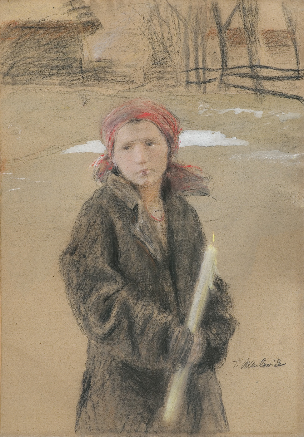 Teodor Axentowicz był jednym z pierwszych polskich artystów malujących, tak później popularne, obrazy z życia Hucułów. Motywy huculskie powtarzał w wielu wariantach i układach kompozycyjnych, malowanych olejno, akwarelą bądź pastelami. Wśród nich powracały także przedstawienia huculskiej dziewczyny z gromnicą, obrazy nawiązujące do obchodów święta Matki Boskiej Gromnicznej, obchodzonego w kościele wschodnim w dniu 15 lutego. Poświęcona w cerkwi grom...