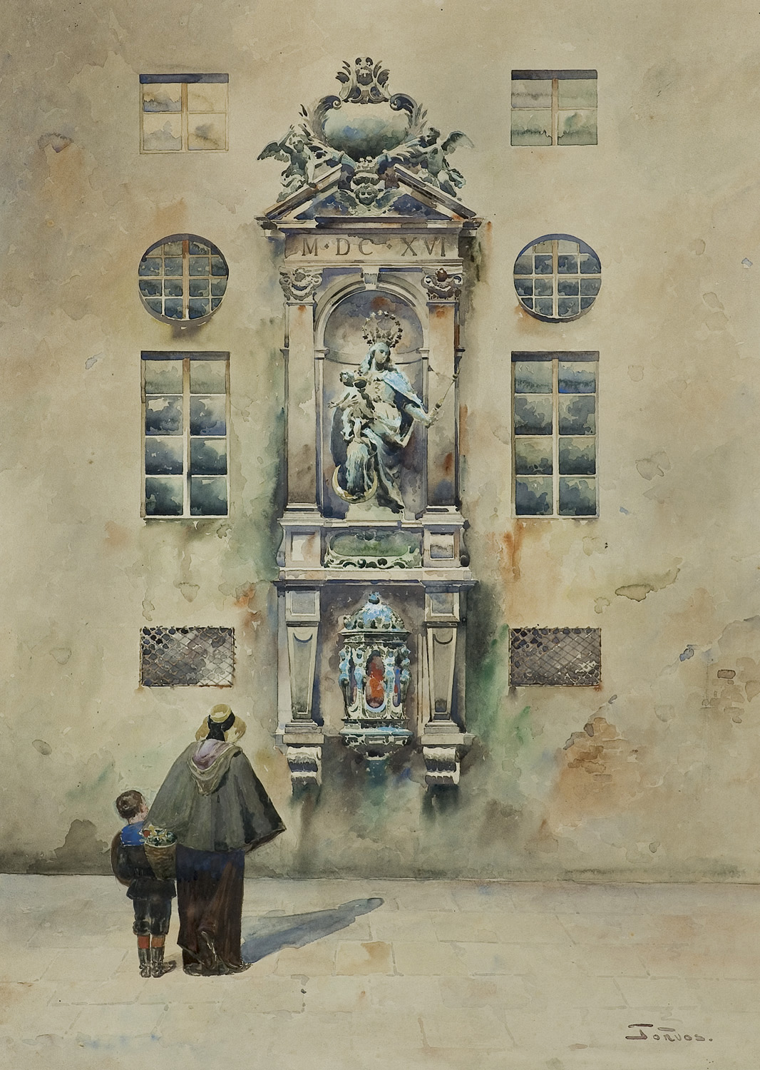 Stanisław Tondos (Kraków 1854-Kraków 1917) znany jest przede wszystkim jako malarz swego rodzinnego miasta Krakowa. Tu po ukończeniu gimnazjum, w latach 1869-1975 kształcił się w Szkole Sztuk Pięknych pod kierunkiem Władysława Łuszczkiewicza i Jana Matejki. Studia kontynuował w Wiedniu, a przez krótki czas także w Akademii monachijskiej u Otto Seitza. Już w początkach swej twórczości zajął się malarstwem wedutowym. Wyjeżdżał do Wenecji, Pragi, Wiednia, Rapperswillu, Norymbergi, Magdeburga malując widoki architektury tych miast. Jego ulubioną, najczęściej stosowaną i mistrzowsko opanowaną techniką była akwarela, ale malował także olejno i pastelami. Najliczniejszą grupę jego dzieł stanowią widoki Krakowa. Obrazy te przedstawiając – często już nieistniejące – domy, uliczki, zaułki są dziś świadectwem minionego czasu, ważnym dokumentem ikonograficznym. Artysta malował też widoki z innych miast Polski - Lwowa, Poznania, Warszawy. W 1886 wspólnie z Juliuszem Kossakiem namalował cykl 24 akwarel, które następnie ukazały się w tece graficznej jako "Klejnoty m. Krakowa". W latach późniejszych powstały jeszcze cykle akwarel "Kościół Mariacki w Krakowie" (1892), "Wawel przeszłości skarbnica, siedziba Piastów i Jagiellonów" (1910), "Kraków Legiony" (1915-1917), malowane tym razem we współpracy z Wojciechem Kossakiem, który był autorem sztafażu – sylwetek ludzi, koni, scenek rodzajowych. Począwszy od 1875 Tondos regularnie wystawiał swe prace w Towarzystwie Przyjaciół Sztuk Pięknych w Krakowie. Brał też udział w wystawach w Warszawie, m.in. w Towarzystwie Zachęty i w Salonie Krywulta. Wiele prac artysty spopularyzowano w formie pocztówek wydawanych nakładem wydawnictwa Salonu malarzy Polskich. W 1900 na wystawach kart pocztowych w Warszawie i w Paryżu Tondos został odznaczony złotymi medalami „za wysoce artystycznie odtworzenie w projektach akwarelowych miast polskich – Lwowa, Krakowa, Warszawy”.