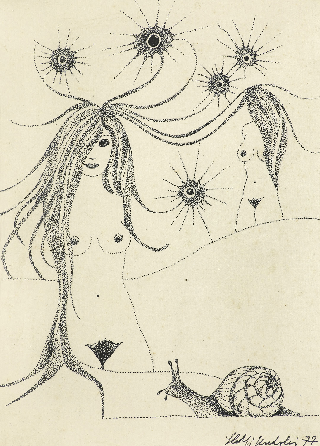 Kazimierz Mikulski (Kraków 1918 - Kraków 1998) rozpoczął studia malarskie przed II wojną światową w ASP w Krakowie, kontynuował je w latach 1939-1940 pod kierunkiem prof. Fryderyka Pautscha w Kunstgewerbeschule, powstałej za okupacji w miejsce Akademii. Po wojnie ukończył dwuletnie studia aktorskie w Studio Dramatycznym przy Starym Teatrze w Krakowie i do 1948 pracował jako aktor. Jednocześnie w 1945 ukończył Warsztat Filmowy Młodych. W latach 1948-1979 był kierownikiem plastycznym i scenografem Teatru Groteska w Krakowie, dla którego projektował lalki, kostiumy, dekoracje itp. Równolegle cały czas zajmował się malarstwem i działalnością w kręgu Tadeusza Kantora, zrazu jako członek Gru-py Młodych Plastyków, a od 1957 w Grupie Krakowskiej, której był współzałożycielem i prezesem w latach 1965-1967. Był też członkiem zespołu teatru Cricot 2, grał m.in. w spektaklach Kurka wodna, Nadobnisie i koczkodany, Umarła klasa oraz we własnej sztuce Cyrk. W swych obrazach z drugiej poł. lat 40. artysta przedstawiał lekkie, linearne formy unoszące się w pustych przestrzeniach. Było to malarstwo zarazem surrealistyczne i abstrakcyjne. Lecz już ok. 1950 zaczął malować w charaktery-styczny dlań sposób - odrzucając abstrakcję, prezentował niezliczone warianty i układy kilku ulubionych motywów (głowa lub postać kobiety-lalki, koty, motyle).