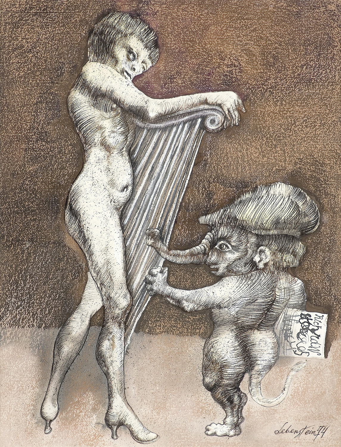 Jan Lebenstein (Brześć Litewski 1930 - Kraków 1999) w latach 1948-1954 studiował malarstwo w ASP w Warszawie pod kierunkiem prof. Eugeniusza Eibischa i Artura Nachta-Samborskiego. W 1955 wziął udział w wystawie w warszawskim Arsenale. Zaprzyjaźniony w czasie studiów z Mironem Białoszewskim, swą pierwszą wystawę indywidualną pokazał w 1956 w Teatrze na Tarczyńskiej. W 1959 zdobył Grand Prix de la Ville de Paris na I Biennale Młodych w Paryżu i w tym roku przeniósł się na stałe do Paryża. Po seriach "figur kreślonych" (na papierze milimetrowym) i "figur hieratycznych" z lat 1955-1958 maluje cykl "figur osiowych" (1958-1962), które wystawia w Paryżu i USA. Równolegle w 1960 zaczyna rysowane "karnety", rodzaj dziennika, który w przyszłości dostarczy motywów wykorzystanych w obrazach. W latach 1964-1965 maluje "Bestiarium", cykl fakturowych, archaizowanych stworów przypominających prehistoryczne wykopaliska. Bezpośrednio po nich wprowadza do swych obrazów postaci ludzkie i fantastyczne, odgrywające sceny ni to mitologiczne, ni to ze snu, często przesycone erotyką. W 1970 projektuje witraże dla Centre du Dialogue w Paryżu. W W 1971 otrzymuje obywatelstwo francuskie 1974 powstają gwasze inspirowane Folwarkiem zwierzęcym George'a Orwella. W latach 1976-1989 tworzy wyłącznie w technice gwaszu i pastelu, podejmując tematykę mitologiczną i zaczerpniętą z Biblii: cykle ilustracji do Księgi Hioba (wyd. 1979) i do Apokalipsy (wyd. 1986) w nowych przekładach Czesława Miłosza. W 1989 powraca do malarstwa olejnego (cykl "Pergamon"). Artysta otrzymał m. in. nagrodę Fundacji im. Alfreda Jurzykowskiego w 1976, Nagrodę Muzeum Archidiecezji Warszawskiej w 1985, Nagrodę im. Jana Cybisa w 1987.