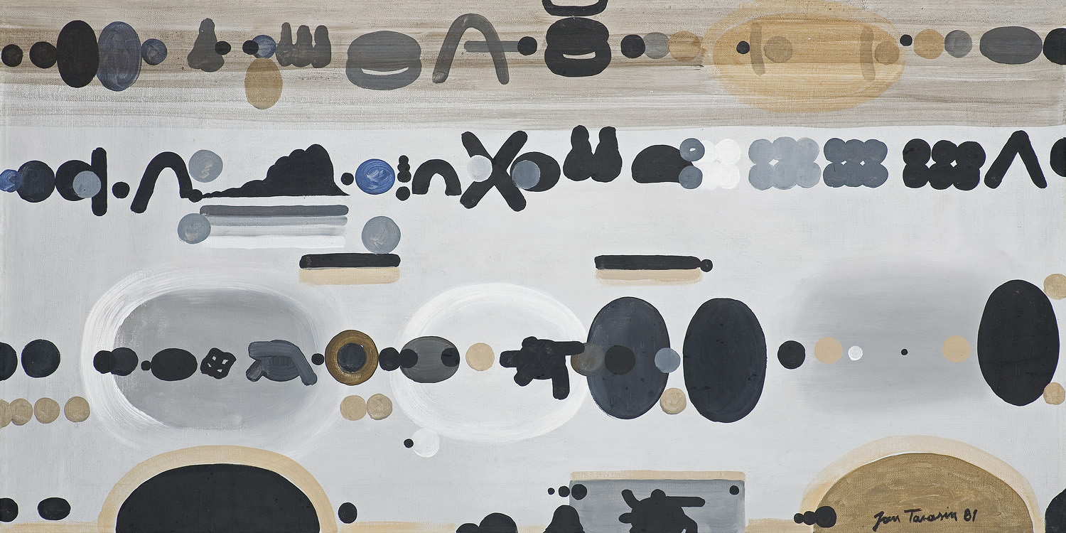 Jan Tarasin (Kalisz 11 IX 1926 - Warszawa 8 VIII 2009) studiował malarstwo w ASP w Krakowie pod kierunkiem prof. Zbigniewa Pronaszki (1946-1951). Jeszcze jako student zadebiutował na I Wystawie Sztuki Nowoczesnej w Krakowie w 1948/49. W połowie lat 50. stworzył cykle litografii: „Nowa Huta i jej mieszkańcy“, 1954, „Dom“, 1955). W pierwszym przeciwstawił się oficjalnemu optymizmowi, w drugim, operując symboliką martwej natury, zawarł treści egzystencjalne i odnoszące do niedawnego dramatu wojny. Po 1956 zaczął malować obrazy niefiguratywne. Układy wyodrębnionych elementów (określanych jako „przedmioty“) umieszczane były przez artystę na płaszczyźnie (cykl „Wnętrze“, 1957) ), lub w aluzyjnej przestrzeni (cykle „Uczta“, 1957, „Brzeg“, 1962-1964, „Przedmioty policzone“, od 1968, „Antykwariat“, 1968). Zasada ta utrzymuje się w jego malarstwie w następnych latach, różnice między okresami twórczości dotyczą sposobu opracowania „przedmiotów“ i ich usytuowania w przestrzeni obrazu lub wobec tła. Od lat 70. „przedmioty“ zmieniają się w graficzne, zwykle czarne znaki na jasnych tłach (cykl „Kolekcja“, od 1971). Tła z kolei bywają iluzyjnie przestrzenne, zróżnicowane walorowo, miękkie. W latach 90. artysta wrócił do kolorystycznego, bardziej malarskiego rozwiązywania zarówno znaków, jak i teł, często ciemnych lub przenikających się z „przedmiotami“ (cykl „Wylęgarnia przedmiotów“, 1992). Tarasin od 1962 jest członkiem „Grupy Krakowskiej“. W 1963-67 uczył na Wydziale Architektury Wnętrz krakowskiej ASP. W 1967 przeniósł się do Warszawy, w 1974 podjął pracę pedagogiczną na Wydziale Malarstwa ASP w Warszawie. W 1987-90 był rektorem tej uczelni. W 1976 otrzymał Nagrodę Krytyki Artystycznej im. Cypriana Kamila Norwida, w 1984 Nagrodę im. Jana Cybisa.; Nagroda na MB Sztuki w San Marino 1965. Równolegle z malarstwem zajmował się rysunkiem i grafiką - do lat 60. litografią, od 1974 serigrafią. W 1974-1981 wydał 8 autorskich „Zeszytów“ z serigrafiami i własnymi tekstami. W 1995 w Galerii Zachęta odbyła się wystawa artysty, której towarzyszył monograficzny katalog.