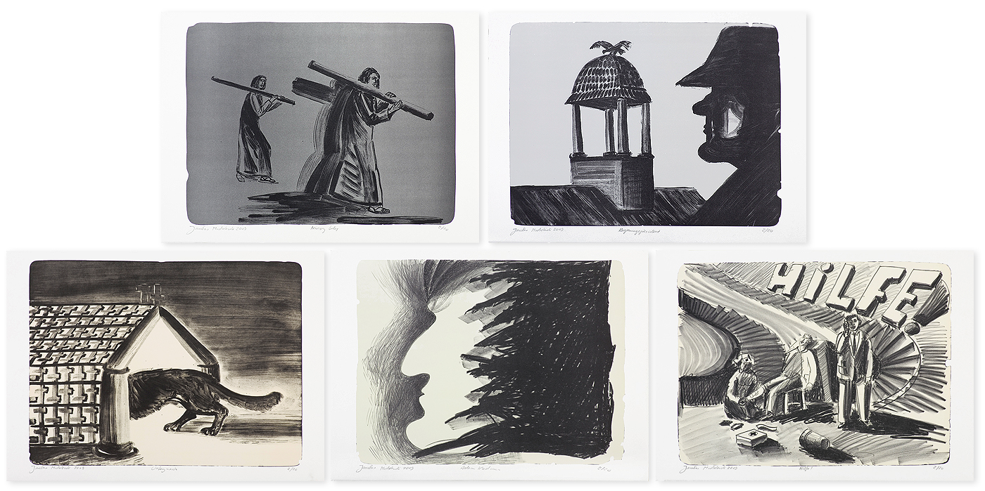 Jarosław Modzelewski (Warszawa 1955, mieszka w Warszawie) studiował malarstwo w ASP w Warszawie w latach 1975-1980, uzyskując dyplom w pracowni Stefana Gierowskiego. Od 1982 pracuje jako pedagog na macierzystym wydziale. W 1982 był współzałożycielem „Gruppy”, najważniejszego ugrupowania nurtu nowej ekspresji lat 80., działającego do 1992. W latach 1991-1996 wspólnie z Markiem Sobczykiem prowadził prywatną Szkołę Sztuki w Warszawie. Od wielu lat współpracuje z Galerią Zderzak w Krakowie. W początkowym okresie twórczości skłaniał się ku abstrakcji, wykorzystywał uproszczone znaki i emblematy oraz sylwetki odbite z szablonu. W 1985 namalował cykl oparty na ilustracjach do podręczników języka rosyjskiego, obrazujący proste czynności, których czasownikowe określenia stanowią tytuły prac. W 1986-1989 powstawały obrazy utrzymane w konwencji realistycznej, jednak zarazem o surrealnej atmosferze uzyskiwanej różnymi metodami, np. przez dublowanie figur, ukazywanie postaci w sytuacji niepewności czy zagrożenia, zabiegi z przestrzenią. W grupie obrazów z 1988 artysta rezygnuje z postaci ludzkiej na rzecz wyjątkowego nasycenia emocją samej przestrzeni pejzaży i wnętrz. Około 1990 wraca do kompozycji akcentujących czynności wykonywane przez postaci, które często umieszczone są w pustej, zaledwie zasugerowanej, acz dominującej przestrzeni. Odrealnienia i monumentalności dodaje tym obrazom płaskie i rozległe kładzenie koloru.