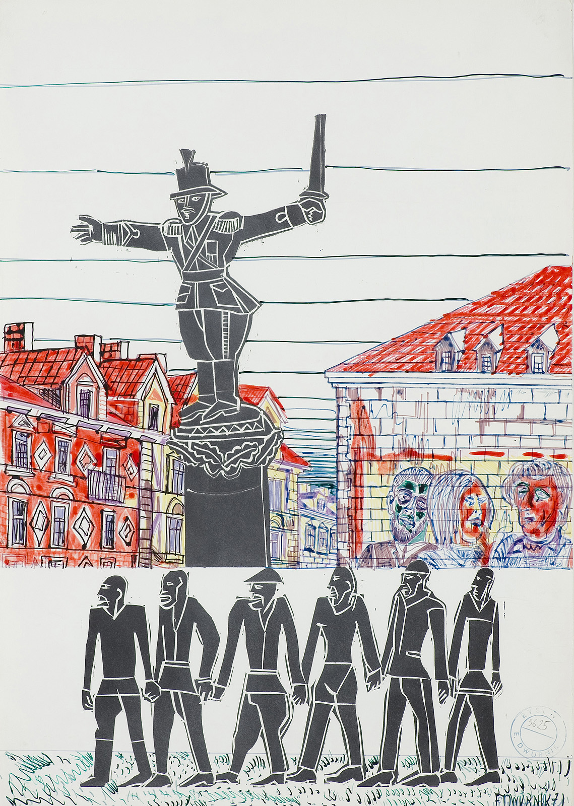 Edward Dwurnik (Radzymin 19 IV 1943 - Warszawa 28 X 2018) studiował malarstwo w ASP w Warszawie (1963-1970), jednak jako swego „mistrza“ wymienia Nikifora. Jego to prace, zobaczone po raz pierwszy w 1965, zainspirowały ówczesnego studenta III roku do narysowania pierwszych prac z cyklu „Podróże autostopem“, które kontynuował w nastepnych latach. W 1972-1978 powstawał cykl „Sportowcy“, w którym portretowane były, dodajmy - kąśliwie, typowe postaci z lat 70. Równolegle od 1975 powstawał cykl „Robotnicy“, który kulminował w okresie „Solidarności“ 1980-1981. Za prace z tego cyklu Dwurnik otrzymał w 1981 Nagrodę Krytyki Artystycznej im. Cypriana Kamila Norwida, natomiast za obrazy z cyklu „Warszawa“ (1981), proroczo zapowiadające stan wojenny - Nagrodę Kulturalną „Solidarności“ podziemnej w 1983. W latach 80. malarstwo Dwurnika przybrało wyraz ekspresyjny i dramatyczny. Powstające w tej dekadzie obrazy miały niejednokrotnie wymowę polityczną, przybierały też kostium historyczny, tak czy inaczej odnoszący się do współczesnych spraw i realiów. Cykl „Droga na Wschód“ (1989-91) upamiętniał ofiary stalinizmu, natomiast cykl „Od Grudnia do Czerwca“ (1990-94) - ofiary stanu wojennego. Zarówno ideowe, jak i czysto malarskie walory tych prac przyniosły artyście ogromne uznanie, zarówno w kraju jak i za granicą. Jego wyrazem była prestiżowa nagroda Fundacji Coutts & Co w Zurychu (1992). W latach 90. powstają cykle będące kontynuacją „Podróży autostopem“: „Niebieskie miasta“ (od 1993) i „Diagonale“ (od 1996), jak również kompozycje nowego typu, jak widoki morskie (cykl „Błękitne“, 1992-93) czy cykl „Wyliczanka“ (1996-99). Artysta wiele wystawia, miał ok. 100 wystaw indywidualnych w Polsce i za granicą, brał też udział w licznych wystawach i festiwalach krajowych i międzynarodowych, m.in.: X Biennale Sztuki Współczesnej, Menton 1974, Documenta 7, Kassel 1982, 5th Biennale, Sydney 1985, XIX Biennale Sztuki, Sao Paulo 1987; Olimpiada Sztuki, Seul 1988. Równolegle z malarstwem uprawiał rysunek, collage, grafikę warsztatową (litografia, techniki metalowe, kserografia, stemple) i użytkową (ilustracja, plakaty do własnych wystaw indywidualnych).