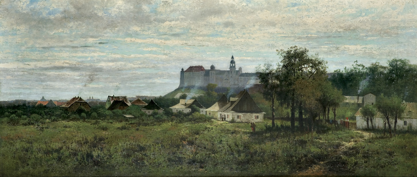 Prezentowany tu Zamek Królewski w Krakowie pochodzi z najpłodniejszego okresu twórczości artysty, a zarazem z czasów jego największego powodzenia na polu (i rynku) sztuki. Jak wskazuje data umieszczona przy sygnaturze, obraz powstał w roku 1873 i jest pierwszą wersją większej kompozycji namalowanej w tymże roku i przedstawiającej ten sam motyw pejzażowy, choć z odmiennym sztafażem (artysta dodał tu postać pastuszka i pasące się krowy, ale pominął postacie kobiece; obraz w zbiorach MNW; ol. pł., 67,5 x 159,5 cm; nr inw. MP 406 MNW).