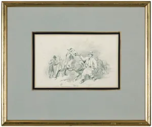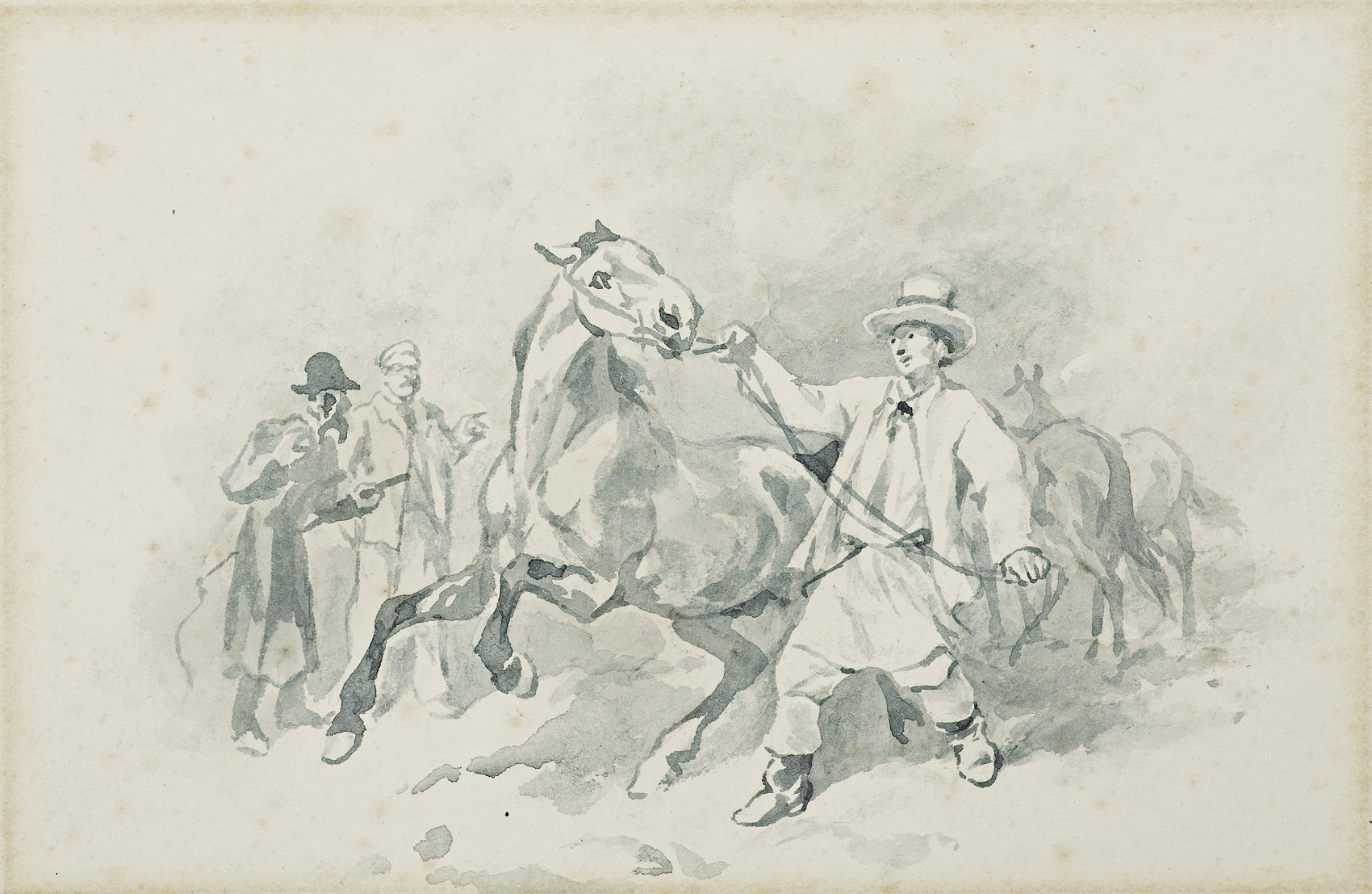 Juliusz Kossak (Wiśnicz 1824 - Kraków 1899) - malarz i ilustrator - był jednym z najpopularniejszych artystów polskich 2. połowy XIX wieku. Naukę rysunku i malarstwa rozpoczął we lwowskiej pracowni Jana Maszkowskiego; później wiele rysował z natury odwiedzając majątki szlacheckie na Ukrainie, Podolu i Wołyniu. W roku 1852 był w Wiedniu, na Węgrzech i w Petersburgu, a następnie zamieszkał na stałe w Warszawie. Lata 1856-1860 spędził w Paryżu, gdzie przyjaźnił się z Horacem Vernetem. Powróciwszy do Warszawy w latach 1862-1868 był kierownikiem artystycznym „Tygodnika Ilustrowanego”. W roku 1869 przeniósł się na stałe do Krakowa, skąd wyjeżdżał jeszcze do Monachium, by malować w atelier batalisty Franza Adama. Kossak był przede wszystkim znakomitym akwarelistą; rzadziej posługiwał się techniką olejną. Malował obrazy historyczne i batalistyczne, sceny rodzajowe ilustrujące życie i tradycje dworu szlacheckiego oraz obyczaje polskiego ludu. Ale prawdziwymi bohaterami jego obrazów były konie, których ruch, temperament, charakter i indywidualność potrafił po mistrzowsku przedstawić. Był także autorem wielu ilustracji do czasopism i książek, trafiającym bezbłędnie tak w klimat utworów literackich, jak i w tęsknoty i potrzeby odbiorców - czytelników Pieśni o ziemi naszej Wincentego Pola, Trylogii Henryka Sienkiewicza, Pana Tadeusza i poematów Adama Mickiewicza.
