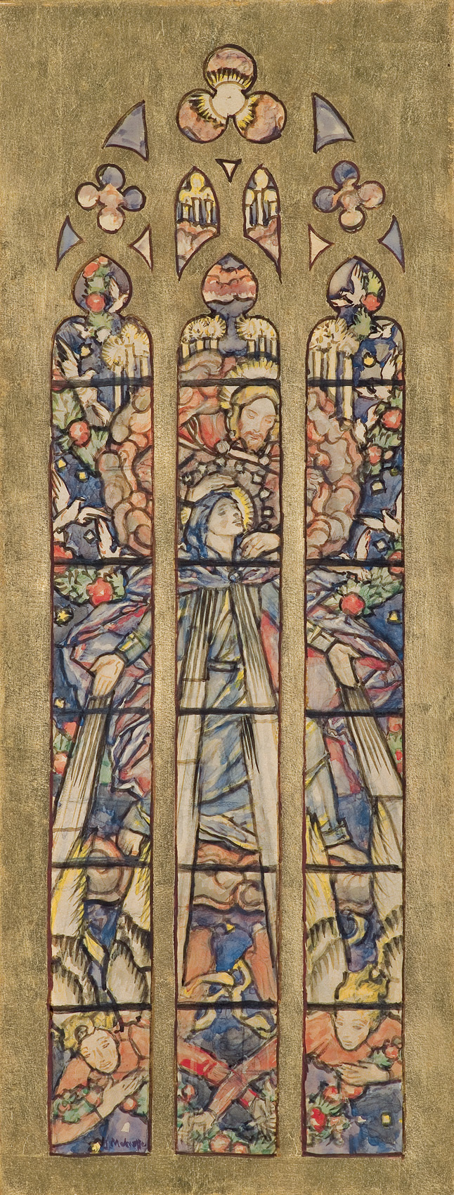 Józef Mehoffer (Ropczyce 1869-Wadowice 1946) - malarz, grafik, scenograf i pedagog; obok Stanisława Wyspiańskiego był najwybitniejszym polskim twórcą witraży i polichromii. Uczeń Jana Matejki i uczelni paryskich - Ecolé des Beaux Arts i Accadémie Colarossi - swą drogę twórczą rozpoczął w latach 1889-1891 od pracy nad polichromią Kościoła Mariackiego w Krakowie (pod kierunkiem Matejki). W roku 1895 otrzymał I nagrodę na międzynarodowym konkursie na witraże do kolegiaty we Fryburgu w Szwajcarii (ich realizacja trwała aż do 1934). W latach następnych otrzymywał różne inne zamówienia na witraże i polichromie, m.in. dla katedry na Wawelu i w Płocku, katedry Ormiańskiej we Lwowie, dla kościołów w Opawie, Onnes w Szwajcarii, w Jutrosinie, we Włocławku czy Przemyślu (nie wszystkie zrealizowane). Był wybitnym reprezentantem sztuki secesji. Tworzył dekoracyjnie traktowane portrety, w tym autoportrety i portrety żony, a także obrazy o zabarwieniu rodzajowym, które w latach 1895-1917 zyskiwały wymowę kompozycji symbolicznych. Malował także pejzaże łączące secesyjną dekoracyjność ze zdobyczami impresjonizmu. Z mistrzowską biegłością posługiwał się różnymi technikami - olejem, temperą, akwarelą i gwaszem - zajmował się także grafiką. Ostatnia wielka wystawa dzieł artysty, zatytułowana Opus magnum, odbyła się w roku 2000 w Muzeum Narodowym w Krakowie.