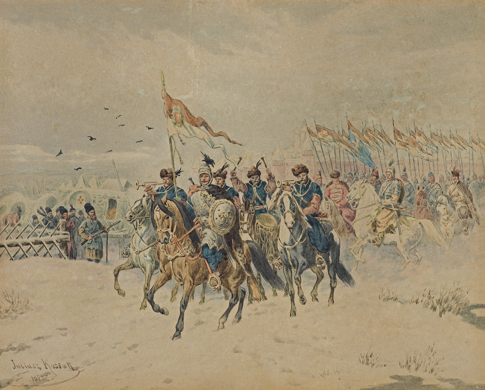 Juliusz Kossak (Wiśnicz 1824 - Kraków 1899) - malarz i ilustrator - był jednym z najpopularniejszych artystów polskich 2. połowy XIX wieku. Naukę rysunku i malarstwa rozpoczął we lwowskiej pracowni Jana Maszkowskiego; później wiele rysował z natury odwiedzając majątki szlacheckie na Ukrainie, Podolu i Wołyniu. W roku 1852 był w Wiedniu, na Węgrzech i w Petersburgu, a następnie zamieszkał na stałe w Warszawie. Lata 1856-1860 spędził w Paryżu, gdzie przyjaźnił się z Horacem Vernetem. Powróciwszy do Warszawy w latach 1862-1868 był kierownikiem artystycznym „Tygodnika Ilustrowanego”. W roku 1869 przeniósł się na stałe do Krakowa, skąd wyjeżdżał jeszcze do Monachium, by malować w atelier batalisty Franza Adama. Kossak był przede wszystkim znakomitym akwarelistą; rzadziej posługiwał się techniką olejną. Malował obrazy historyczne i batalistyczne, sceny rodzajowe ilustrujące życie i tradycje dworu szlacheckiego oraz obyczaje polskiego ludu. Ale prawdziwymi bohaterami jego obrazów były konie, których ruch, temperament, charakter i indywidualność potrafił po mistrzowsku przedstawić. Był także autorem wielu ilustracji do czasopism i książek, trafiającym bezbłędnie tak w klimat utworów literackich, jak i w tęsknoty i potrzeby odbiorców - czytelników Pieśni o ziemi naszej Wincentego Pola, Trylogii Henryka Sienkiewicza, Pana Tadeusza i poematów Adama Mickiewicza.