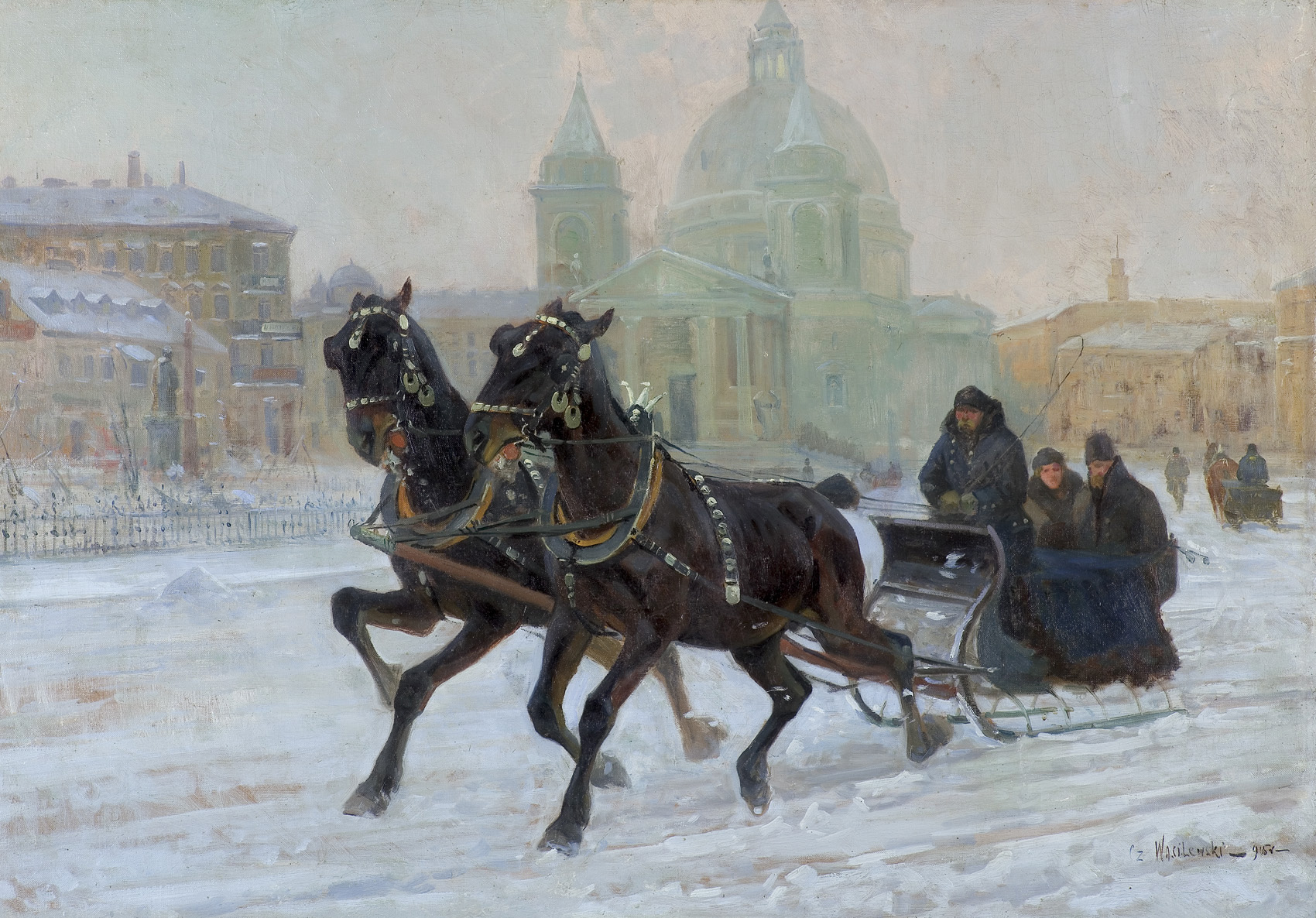Czesław Wasilewski (ok. 1875 - Warszawa/ Łódź 1946?47) to popularny w okresie międzywojennym warszawski malarz, autor obrazów inspirowanych płótnami Kossaka, Brandta, Chełmońskiego, Wierusza-Kowalskiego czy Fałata. Był samoukiem; wprawdzie w 1911 zapisał się do warszawskiej Szkoły Sztuk Pięknych, ale o jego studiach nic bliższego nie wiadomo. Być może uczęszczał tam (1913-1917) do pracowni Wojciecha Kossaka, dla którego później, na początku lat dwudziestych, przygotowywał podmalówki do obrazów. Uczestniczył w wystawie w Lublinie (1922), wystawiał na Salonach warszawskiej Zachęty (1925,1926, 1927), w Katowicach (1926), Częstochowie (1927), Gdyni (1929), Kaliszu (1931), Poznaniu (1928, 1931). Malował przede wszystkim liczne zaprzęgi, sanny, wyjazdy na polowania, wypadki w podróży, ułanów na patrolu, łosie, sarny i dziki w lesie. Tworzył także nastrojowe pejzaże, wyraźnie inspirowane malarstwem J. Chełmońskiego Rzadziej malował także kwiaty i martwe natury. Utożsamiany z malarzem o nazwisku „Zygmuntowicz”, którego prace pojawiały się na rynku sztuki od trzydziestych lat XX wieku. Stawiany przed tym nazwiskiem inicjał I. lub F., sugerować może imię Ignacy lub Franciszek. Sylwetkę malarza bliżej omówił S. Bołdok w artykule Malarz o dwóch nazwiskach (Art and Business 1992, nr 7-8, s. 48-49).