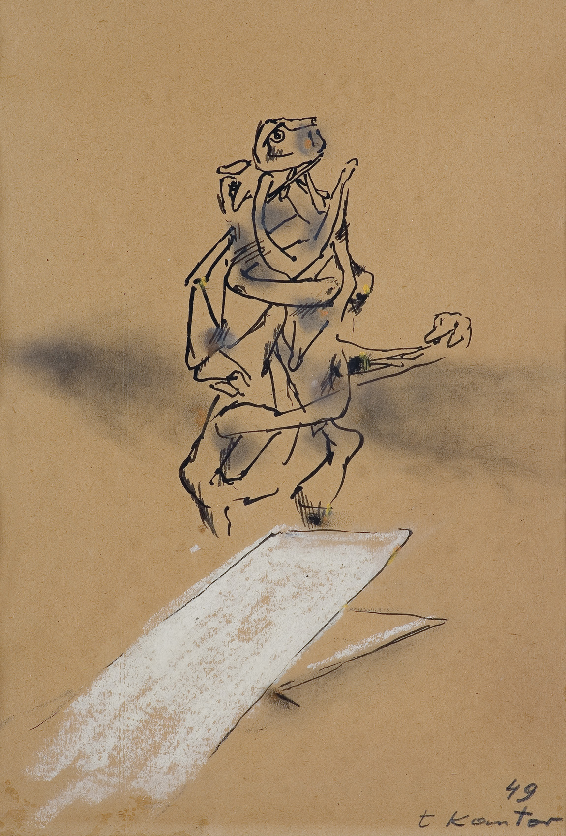 Tadeusz Kantor (Wielopole Skrzyńskie 1915 - Kraków 1990) studiował scenografię w ASP w Krakowie w latach 1934-1939. W 1942 założył Teatr Podziemny, który działał do 1944, dając dwa spektakle: "Balladynę" i "Powrót Odysa". W trakcie prac nad spektaklami zawiązało się grono artystów, którzy w 1945 utworzyli pod wodzą Kantora „Grupę Młodych Plastyków“. Ta z kolei stała się zalążkiem zarówno eksperymentalnego teatru Cricot 2 (utworzonego w 1955), jak i drugiej „Grupy Krakowskiej“ (utworzonej w 1957). W 1947 Kantor przebywał na rocznym stypendium w Paryżu, po powrocie był jednym z organizatorów I Wystawy Sztuki Nowoczesnej, Kraków 1948/49. W latach 1950-1954 nie uczestniczył w wystawach. Od 1955 jego twórczość biegła dwutorowo. Z jednej strony działał jako malarz, twórca „ambalaży“, od 1965 happeningów, z drugiej - poświęcał się pracy nad kolejnymi spektaklami Cricot 2, z których każdy był wydarzeniem artystycznym, zwłaszcza od lat 70.: "Umarła klasa" (premiera 1975), "Wielopole, Wielopole" (1980), "Niech sczezną artyści" (1985), "Nigdy tu już nie powrócę" (1988); zmarł po ostatniej próbie spektaklu "Dzisiaj są moje urodziny" (premiera 1991). Współpracował stale z galeriami: Krzysztofory w Krakowie (gdzie również miał siedzibę teatr Cricot 2) i Foksal w Warszawie. Od 1979 wraz z teatrem Cricot 2 przebywał głównie we Florencji. Był teoretykiem sztuki i teatru, autorem wielu manifestów. Uczestniczył w wystawach miedzynarodowych najwyższej rangi, jak Documenta w Kassel (1959, 1965), Biennale w Wenecji (1960), Biennale w Sao Paulo (1967). Otrzymał m.in. Prix Rembrandt Fundacji Goethego, Bazylea 1978, Medal „Arts et Lettres“ Ministra Kultury Francji 1982, nagrodę Fundacji im. Alfreda Jurzykowskiego, Nowy Jork 1982 i wiele nagród teatralnych.