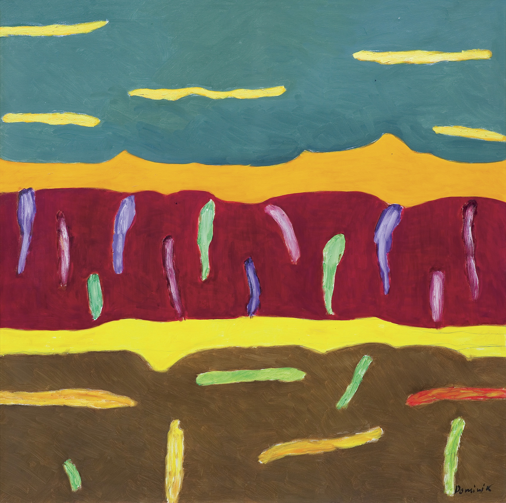 Tadeusz Dominik (Szymanów 14 I 1928 - Warszawa 20 V 2014) studiował na Wydziale Malarstwa ASP w Warszawie pod kierunkiem prof. J.Cybisa (1946-51, dyplom 1953). Od 1951 był pedagogiem na macierzystym Wydziale, początkowo jako asystent Cybisa. Od 1965 prowadził własną pracownię, w 1979 otrzymał tytuł profesora. W 1990 przeszedł na emeryturę. W czasie studiów oddziałały nań - za pośrednictwem osobowości i sztuki Cybisa - idee polskiego koloryzmu, które następnie twórczo i samodzielnie kontynuował. Początkowo tworzył obrazy figuratywne. Debiutował na słynnej wystawie w warszawskim Arsenale w 1955, gdzie zdobył nagrodę. W tym okresie obok malarstwa uprawiał drzeworyt, operujący szerokimi płaszczyznami bieli i czerni (drzeworyty wystawiał m.in. na Biennale w Wenecji w 1956). W drugiej poł. lat 50. zaczął malować obrazy abstrakcyjne, początkowo utrzymane w ekspresyjnej i spontanicznej stylistyce malarstwa informel. W latach 60. wzbogacił swe prace o efekty fakturowe. Niezmienną inspiracją była dla malarza natura, bogactwo i kolorystyka jej form. Pozostał jej wierny do dziś, poddając zmianom sam sposób malowania. Stopniowo rozjaśniał i wygładzał swe kompozycje, wprowadzając efekty dekoracyjne, jak rytmiczne powtórzenia form czy rodzaj malowanych „rastrów“, regularnie znaczących fragmenty kompozycji. Wśród wielu nagród otrzymał m.in. laur „Złotego Grona“ w Zielonej Górze w 1963, Grand Prix Festiwalu Polskiego Malarstwa Współczesnego w Szczecinie w 1968, nagrodę im. George’a Rowney’a w Londynie w 1973 i Nagrodę im. Jana Cybisa w Warszawie w 1973. Równolegle z malarstwem zajmował się gobelinem, ceramiką, również grafiką komputerową.