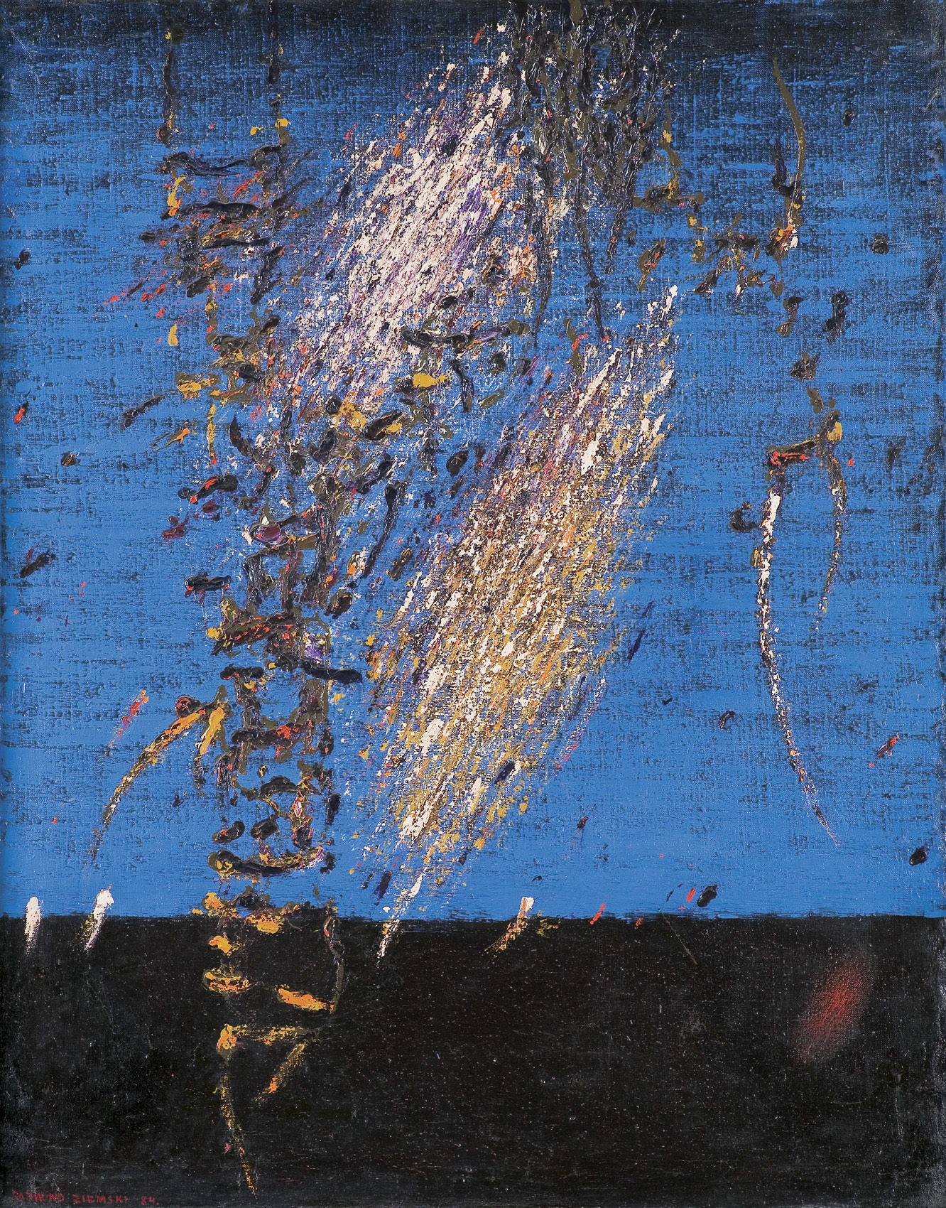 Rajmund Ziemski (Radom 1930 - Warszawa 2005) studiował malarstwo w latach 1949-1955 pod kierunkiem Artura Nachta-Samborskiego w Akademii Sztuk Pięknych w Warszawie. W roku dyplomowym wziął udział w Ogólnopolskiej Wystawie Młodej Plastyki w warszawskim Arsenale. Od 1958 wykłada w macierzystej uczelni, prowadząc w niej pracownię malarstwa, jedną z najchętniej wybieranych przez studentów jako pracownia dyplomowa. Prowadzący ją profesor jest również autorytetem artystycznym, jednym z najwybitniejszych przedstawicieli nurtu abstrakcji niegeometrycznej w polskim malarstwie powojennym. We wczesnym cyklu „Ptaki“ (1957-1958) operował kształtami bardzo uproszczonymi, malowanymi impasto na tłach zazwyczaj ciemnych, często o bogatej fakturze. Od początku lat 60. obrazy Ziemskiego przybrały charakterystyczny kształt wydłużonego prostokąta, w którego polu, niczym rozpięte, dramatyczne płachty, rozpościerały się aluzyjne pola koloru i faktury. Nosiły tytuły sugerujące związki z naturą, jednak górę w nich bierze zainteresowanie malarza kolorem i materią, traktowanymi autonomicznie, w oderwaniu od jakichkolwiek sugestii przedmiotowych. Te powróciły w znamiennym epizodzie z połowy lat 60., kiedy to artysta włączał w strukturę swych obrazów, często wtedy łączonych w Tryptyki, fotograficzne wizerunki twarzy ludzkich. Potem zarzucił ten proceder na rzecz dalszego rozwijania prób kolorystycznych, idących w kierunku ostrych kontrastów i niekiedy kakofonicznych zestawień. Pozostaje przy tym przy ustalonym jeszcze w latach 60. sposobie tytułowania i oznaczania prac (wielki, malowany do dziś cykl „Pejzaże“ z obrazami numerowanymi liczbą łamaną przez datę roczną).