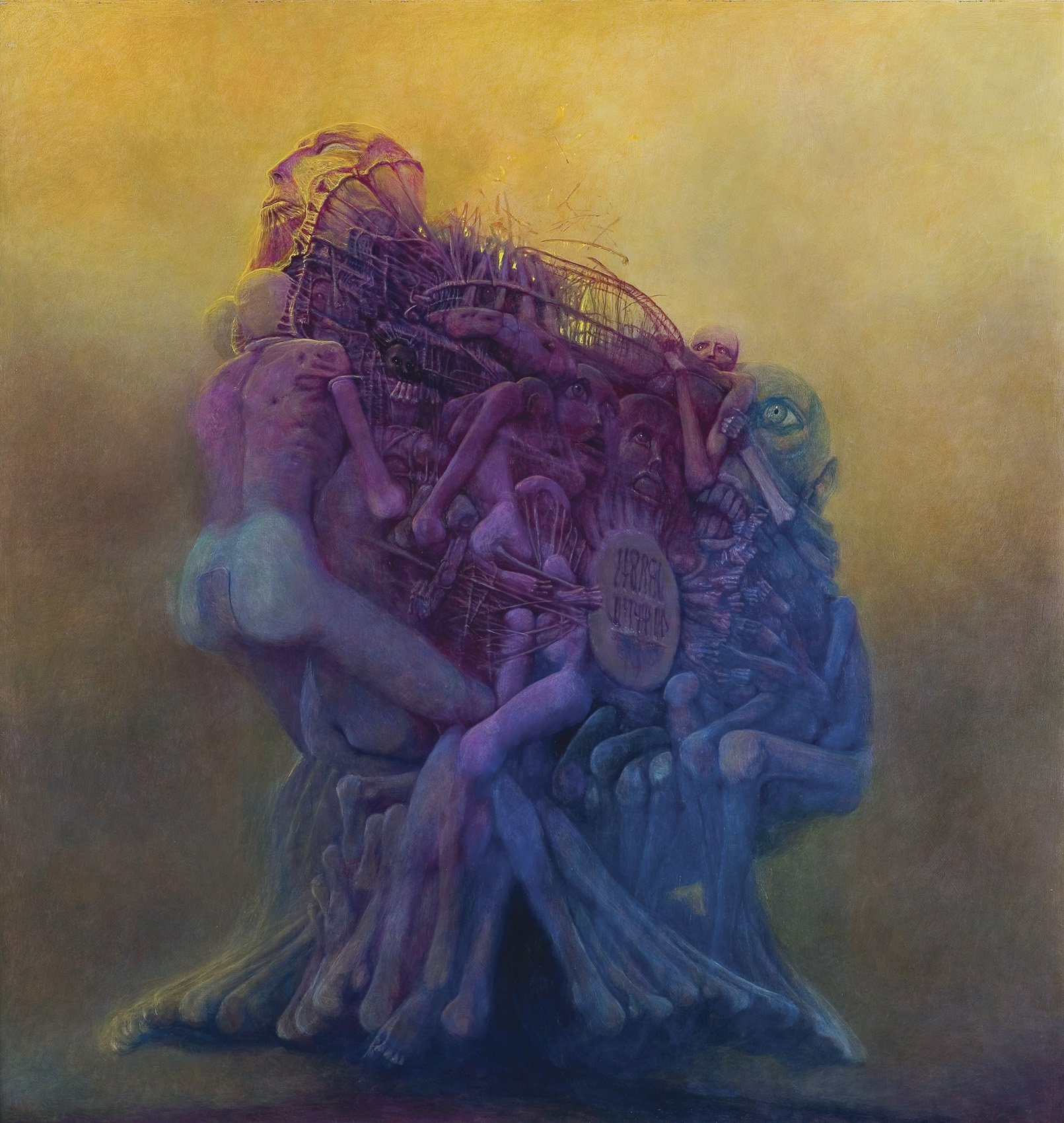 Zdzisław Beksiński (Sanok 24 II 1929 - Warszawa 21 II 2005) studiował w latach 1947-1952 na Wydziale Architektury Politechniki Krakowskiej. Był artystą samoukiem, który osiągnął niekwestionowaną pozycję w polskiej sztuce współczesnej, potwierdzoną obecnością jego prac na prestiżowych wystawach i w kolekcjach muzealnych. Początkowo zajmował się fotografią, którą interesował się od lat studenckich, po 1956 zyskując uznanie jako twórca fotogramów o estetyce opartej o efekty fakturowe. W latach 1958-1962 tworzył abstrakcyjne obrazy-reliefy o bogatej fakturze, głównie metalowe, będące odmianą malarstwa materii. Pod koniec tego okresu powstawały ażurowe formy o kształtach figur i pełnoplastyczne rzeźby w metalu. Kolejnym etapem jego twórczości były lata 1962-1974, kiedy poświęcał się głównie rysunkowi. W latach 60. rysował piórkiem i tuszem figuralne kompozycje odznaczające się karykaturalną deformacją postaci. Od końca lat 60. tworzył rysunki węglem i kredkami, będące monochromatyczną odmianą jego równoległej twórczości malarskiej. Od 1974 zajmował się niemal niepodzielnie malarstwem. Jego charakterystyczny styl bazował na perfekcji technicznej, której towarzyszyła niezwykłość wizji. Malował świat po katastrofie, naznaczony piętnem śmierci i rozpadu. Jego obrazy zaludniają postaci i stwory o ludzkich wprawdzie bądź zwierzęcych kształtach, lecz o cechach fantomów, automatów lub rozpadających się trucheł. Artysta nie nadawał swym obrazom i rysunkom tytułów (poza porządkującymi symbolami), akcentując w ten sposób swój brak zainteresowania dla literackiej strony przedstawień. Sam mówił, że malując całkowicie poddaje się wizji, „fotografuje“ ją. W ostatnich latach włączył do swego warsztatu artystycznego elektroniczne techniki generowania obrazu, które wykorzystywał do tworzenia komputerowych fotomontaży. Sztuka Beksińskiego, wielokrotnie wystawiana i omawiana, budzi skrajne emocje wśród znawców i publiczności.