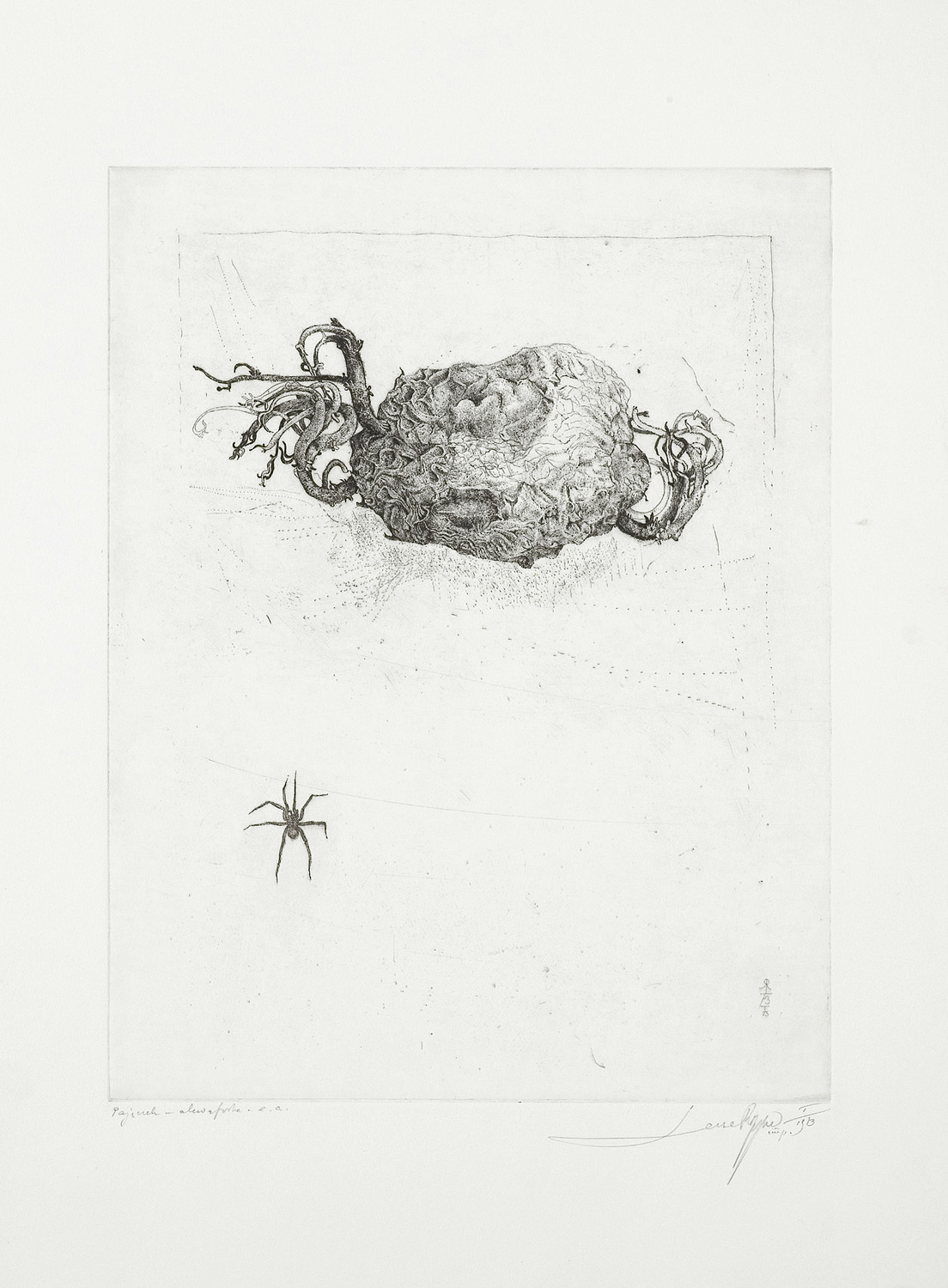 Leszek Rózga (Zgierz 1924 - Łódź 2015) - artysta grafik. W latach 1940-1945 przebywał na robotach w Niemczech, gdzie po zakończeniu wojny pracował w teatrze amatorskim i uczył się prywatnie malarstwa (1945-1947). Studiował w Państwowej Wyższej Szkole Sztuk Plastycznych w Łodzi (1948-1951) i na Wydziale Grafiki Propagandowej w Katowicach - filii ASP w Krakowie, gdzie obronił dyplom w 1954. W latach 1967-1994 był wykładowcą (od 1979 profesorem) w uczelni łódzkiej, gdzie stworzył szkołę metaforycznej, ekspresyjnej sztuki graficznej. Brał udział w licznych wystawach w kraju i za granicą, zdobywając często nagrody. Był również laureatem wielu nagród państwowych, resortowych, regionalnych itp., jak: Nagrody Ministra Kultury i Sztuki I st. 1981, 1986, 1994, Nagroda Woj. Łódzkiego 1972, Nagroda Miasta Łodzi 1985. Działał w ZPAP, był m. in. członkiem Rady Artystycznej Zarządu Głównego 1974-1976. Początkowo zajmował się głównie malarstwem, rysunkiem i monotypią, tworząc nastrojowe widoki miejskie. Od 1960 skupił się na grafice warsztatowej (głównie w technikach metalowych). W latach 70. wprowadzał do swych kompozycji werystycznie odwzorowane rośliny i owoce, inskrypcje, cytaty ze sztuki klasycznej.