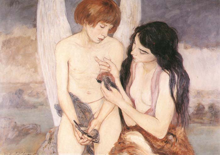 Wlastimil Hofman / Vlastimil Hofmann (Praga 1881 - Szklarska Poręba 1970) studiował w krakowskiej Szkole Sztuk Pięknych - początkowo pod kierunkiem Floriana Cynka, później także u Jana Stanisławskiego, Leona Wyczółkowskiego i Jacka Malczewskiego. W latach 1899-1902 uczył się jeszcze u Jeana Léona Gérôme’a w paryskiej École des Beaux-Arts. W czasie I wojny światowej przebywał w Pradze i w Paryżu; od 1920 stale mieszkał w Krakowie. Dużo wystawiał; należał do wielu stowarzyszeń twórczych - był współzałożycielem „Grupy Pięciu” (1905) i „Grupy Zero” (1908), członkiem Związku Artystów Czeskich „Manes”, a od 1911 członkiem Tow. Artystów Polskich „Sztuka”. W czasie II wojny światowej poprzez ZSRR i Turcję przedostał się do Jerozolimy, skąd w roku 1946 wrócił do Krakowa. Od roku 1947 stale mieszkał w Szklarskiej Porębie. Hofman malował przede wszystkim fantastyczno-symboliczne kompozycje o motywach ludowych oraz sceny rodzajowe, portrety i pejzaże. Jego obrazy mimo bliskich analogii i powiązań ze sztuką Malczewskiego odznaczają się zawsze indywidualnym charakterem, stylem i nastrojem.