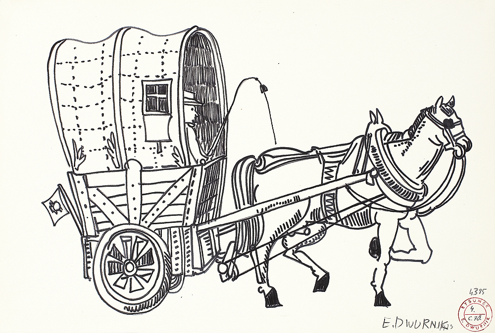 Edward Dwurnik (Radzymin 19 IV 1943 - Warszawa 28 X 2018) studiował malarstwo w ASP w Warszawie (1963-1970), jednak jako swego „mistrza“ wymienia Nikifora. Jego to prace, zobaczone po raz pierwszy w 1965, zainspirowały ówczesnego studenta III roku do narysowania pierwszych prac z cyklu „Podróże autostopem“, które kontynuował w nastepnych latach. W 1972-1978 powstawał cykl „Sportowcy“, w którym portretowane były, dodajmy - kąśliwie, typowe postaci z lat 70. Równolegle od 1975 powstawał cykl „Robotnicy“, który kulminował w okresie „Solidarności“ 1980-1981. Za prace z tego cyklu Dwurnik otrzymał w 1981 Nagrodę Krytyki Artystycznej im. Cypriana Kamila Norwida, natomiast za obrazy z cyklu „Warszawa“ (1981), proroczo zapowiadające stan wojenny - Nagrodę Kulturalną „Solidarności“ podziemnej w 1983. W latach 80. malarstwo Dwurnika przybrało wyraz ekspresyjny i dramatyczny. Powstające w tej dekadzie obrazy miały niejednokrotnie wymowę polityczną, przybierały też kostium historyczny, tak czy inaczej odnoszący się do współczesnych spraw i realiów. Cykl „Droga na Wschód“ (1989-91) upamiętniał ofiary stalinizmu, natomiast cykl „Od Grudnia do Czerwca“ (1990-94) - ofiary stanu wojennego. Zarówno ideowe, jak i czysto malarskie walory tych prac przyniosły artyście ogromne uznanie, zarówno w kraju jak i za granicą. Jego wyrazem była prestiżowa nagroda Fundacji Coutts & Co w Zurychu (1992). W latach 90. powstają cykle będące kontynuacją „Podróży autostopem“: „Niebieskie miasta“ (od 1993) i „Diagonale“ (od 1996), jak również kompozycje nowego typu, jak widoki morskie (cykl „Błękitne“, 1992-93) czy cykl „Wyliczanka“ (1996-99). Artysta wiele wystawia, miał ok. 100 wystaw indywidualnych w Polsce i za granicą, brał też udział w licznych wystawach i festiwalach krajowych i międzynarodowych, m.in.: X Biennale Sztuki Współczesnej, Menton 1974, Documenta 7, Kassel 1982, 5th Biennale, Sydney 1985, XIX Biennale Sztuki, Sao Paulo 1987; Olimpiada Sztuki, Seul 1988. Równolegle z malarstwem uprawiał rysunek, collage, grafikę warsztatową (litografia, techniki metalowe, kserografia, stemple) i użytkową (ilustracja, plakaty do własnych wystaw indywidualnych).