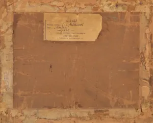 – nalepka salonu sztuki Abe Gutnajera (druk, tusz): Nr. 6023 | Nazwisko Autora J. Malczewski | Tytuł „Kocica“ | Cena LTZZZ Cena | SALON SZTUKI I ANTYKWARNIA | ABE GUTNAJER | WARSZAWA. MAZOWIECKA 11.