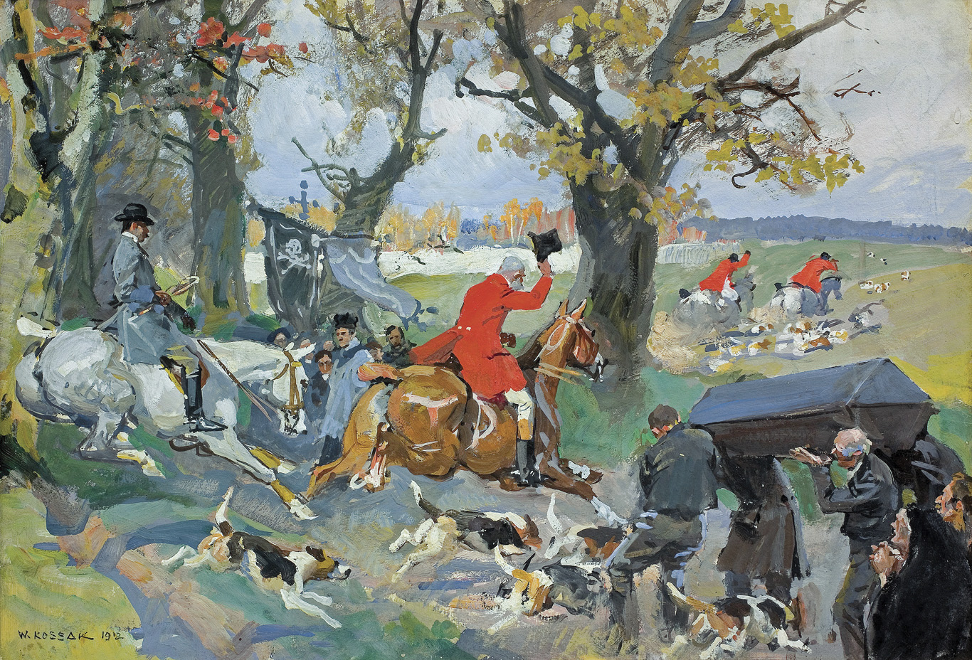 „...Cesarz skinął ręką, przyprowadzono mu konia; /.../ Był to ogromny szpak, nazywał się „Limerick“. Przepyszny koń /.../ Równocześnie z cesarzem, i my wszyscy siedzieliśmy na koniach /.../ Tymczasem ruszono lisa z wikliny, rozległy się okrzyki: „tally ho! tally ho!“ foxhounds zaskowyczały i ruszyły szalonym tempem za nim. Ogromny lis machnął parę razy kitą i zniknął za jakąś winnicą, szybszy od psów popędził w świat. Teraz lecą po jego tropie, nosy różowe jak trufle blisko ziemi, ogony białe, wyprężone, pędzi to wszystko wśród okrzyków trzech Anglików i głosu trąbki, jak huragan, aż powietrze świszczy. Przede mną mur jeźdźców, moja klacz idzie jak maszyna równym, długim, swobodnym galopem /.../ Mija pół godziny, my galopujemy wciąż tym samym tempem... mija drugie pół godziny /.../ Jeźdźców coraz mniej, już między mną a cesarzem coraz mniejsza przestrzeń, nie popuszczę już cesarskiego konia. „Hurry up! Hurry up!“ - krzyczą Anglicy. „Limerick“ przesadził olbrzymim skokiem coś wysokiego, cesarz prześlicznie dosiedział, sadzę i ja, płot wysoki z półtora metra!... „Go on! Go on! Hurry up!“ coraz częściej słychać. Słabsze psy już potrzebują zachęty /.../ Nie widzę już arcyksiężnej, nie widzę wielu starszych panów; było nas ze sześćdziesięciu, a teraz może trzydziestu. Mniejsza z tym, ale co to takiego!? Wiatr świszcząc niesie mi jakiś śpiew chóralny, przed nami horyzont zamknięty aleją jakichś starych drzew... śpiew coraz wyraźniejszy... pewnie to szkoła wiejska hymn dla króla Węgier śpiewa - myślę sobie - a zresztą co mnie to obchodzi, aleja już tuż stare, rosochate lipy gęsto koło siebie... „Limerick“ sadzi znowu, „go on!“, sadzę i ja, klacz skacze jak anioł, krew ją ponosi, oszaleliśmy oboje. Jezusie Mario! A to co? Na lewo i na prawo przerażone chłopięta z książkami w rękach, żałobna, czarna jakaś ciżba, cesarz przede mną, nie mogąc widocznie dla braku miejsca wstrzymać konia, pędzi na drugi rów, uniósłszy tylko cylindra, a ja widzę... widzę najwyraźniej trumnę niesioną na ramionach czterech czarnych ludzi i psy pomiędzy ich nogami pod trumną pędzące tropem. Przesadziłem drugi rów i dognałem cesarza. Lipy nam pogrzeb zasłaniały. Nie było to pewnie cesarzowi miłe, ale jako kontrast malarski ruchu, koloru i życia z czarną śmiercią, nie zapomniany dla mnie obraz."