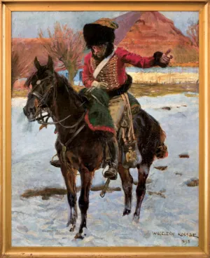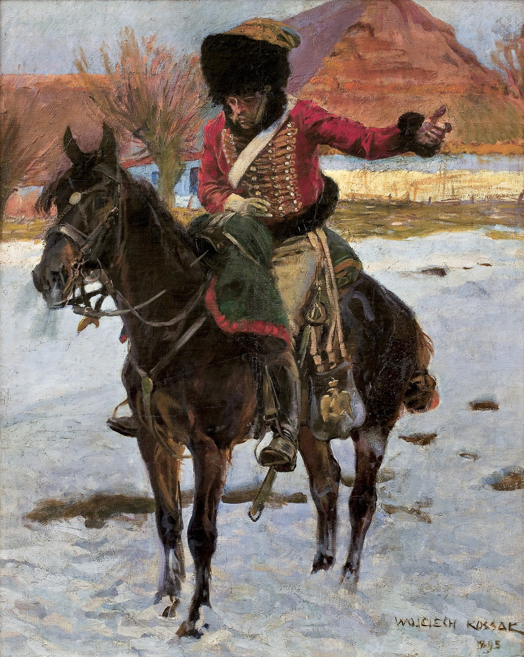 Wojciech Kossak (Paryż 1856 - Kraków 1942 ) – powszechnie znany malarz, postrzegany przede wszystkim jako świetny batalista. Syn i uczeń Juliusza Kossaka kształcił się w krakowskiej Szkole Sztuk Pięknych, w Akademii monachijskiej oraz w Paryżu. W latach 1895-1902 przebywał głównie w Berlinie, pracując dla cesarza Wilhelma II. Wiele podróżował, m.in. do Hiszpanii i Egiptu, gdzie wykonywał szkice do zamierzonych panoram. W późniejszych latach kilkakrotnie wyjeżdżał do Stanów Zjednoczonych wykonując zamówienia portretowe. W 1913 był mianowany profesorem warszawskiej Szkoły Sztuk Pięknych. W latach I wojny światowej pełnił służbę wojskową. Był współautorem panoram: „Racławice” (1893-1894), „Berezyna” (1895-1896), „Bitwa pod piramidami” (1901) oraz szkiców do niezrealizowanej „Somosierry” (1900). Z temperamentem i swobodą tworzył szeroko malowane, dynamiczne sceny batalistyczne, historyczne, rodzajowe oraz liczne portrety. Z upodobaniem malował konie. Jego obrazy, gloryfikujące dawne i współczesne artyście polskie wojsko i bohaterstwo żołnierzy, trafiały do patriotycznych uczuć odbiorców i cieszyły się ogromna popularnością.