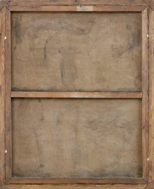 Na górnej listwie krosna nalepka antykwaryczna (druk wypełniony ręką artysty) o treści: Liczba: [..]91 | Autor: Wojciech Kossak | Treść: Nie - [..]acić się muszę .... | Cena sprzedaży: Kor. 4.500. - (suma napisana na małej naklejce)